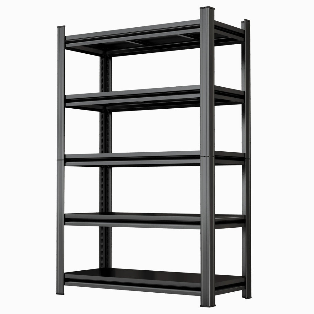 Organize any space efficiently with this heavy-duty 5 tier metal shelving unit, designed to support up to 2,200 pounds (998 kg) in total. Crafted from high-strength metal with reinforced columns, each shelf can bear up to 440 pounds (200 kg), providing robust and stable storage for your garage, workshop, office, or warehouse. The adjustable shelves offer versatile space customization to fit various sized items, while the open-back design ensures easy access and airflow. Its classic black finish combines durability with a clean, modern look. Assembly is quick and tool-free, so you can have your shelving ready in minutes. Elevate your storage solutions today for a clutter-free and organized space.