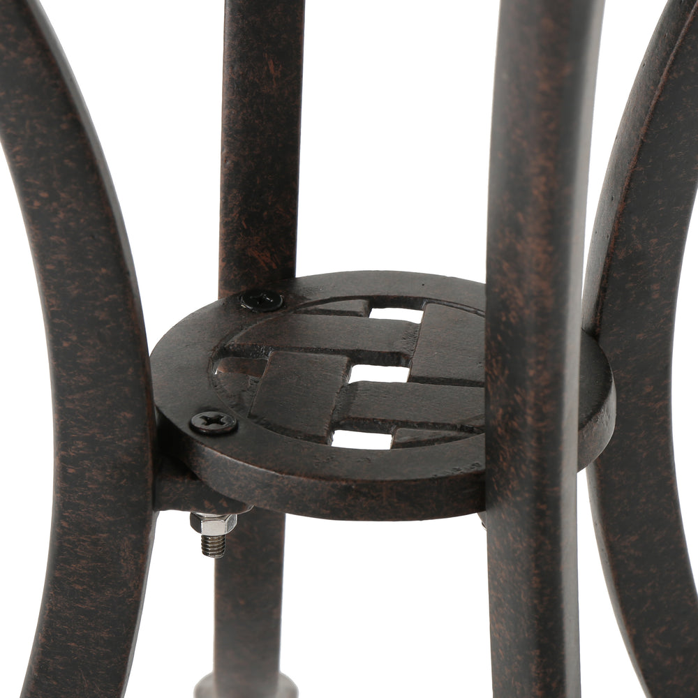 Bring timeless elegance and practical functionality to your patio or garden with this traditional bronze-finished cast aluminum side table. Featuring exquisite curves and a detailed lattice-patterned tabletop, it adds a sophisticated touch to any outdoor setting. Crafted from lightweight yet durable aluminum, this table is rust-resistant, ensuring lasting beauty and performance through all seasons. Its compact 19.25-inch square top provides a perfect surface for drinks, snacks, or decor without crowding your space. Easy to assemble with included tools and instructions, this side table is designed to blend classic style with everyday convenience. Elevate your outdoor gatherings and relaxation moments with this charming, sturdy companion today.