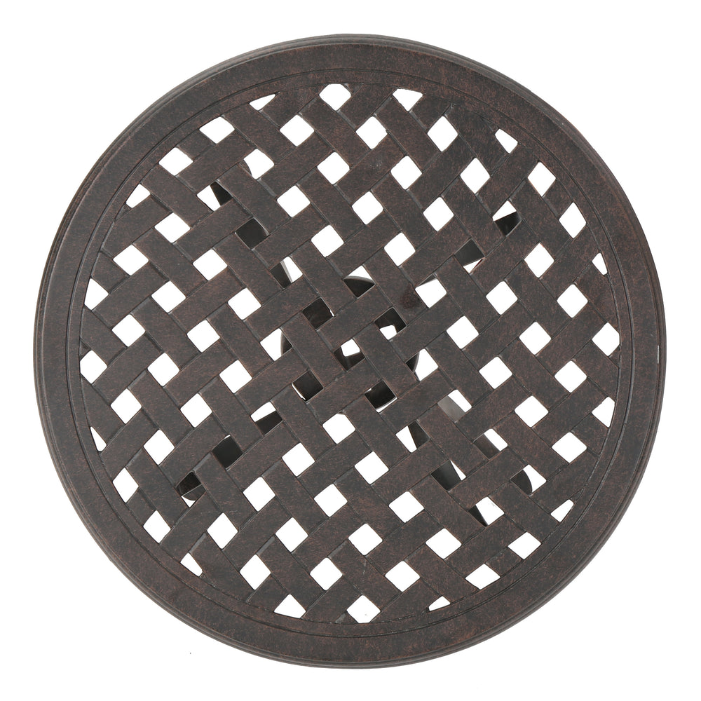 Outdoor cast aluminum side table features a rust-resistant bronze finish with elegant lattice design and curved legs, combining durability and classic style. Ideal for patios or gardens, it offers a charming surface for entertaining and relaxing outside. Assembly required.