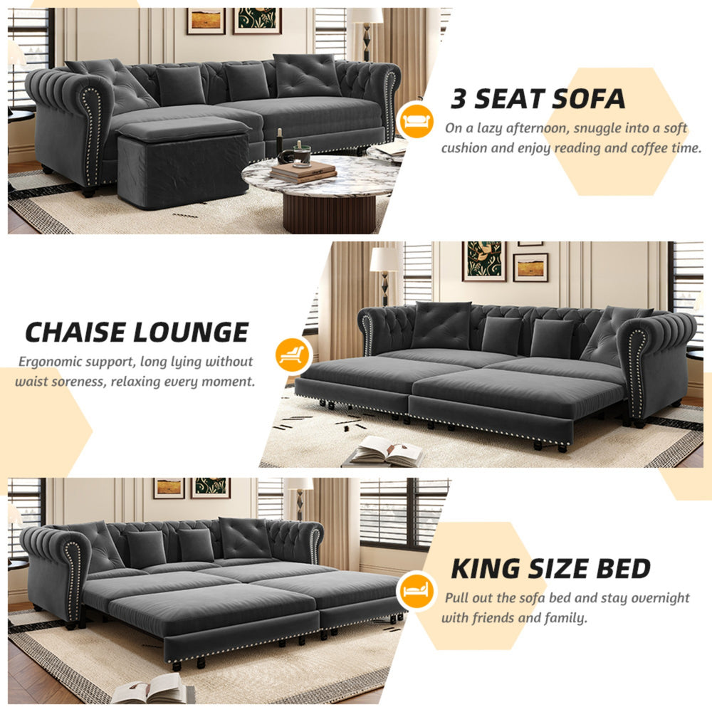 This 3-in-1 convertible sleeper sofa bed features a velvet upholstery with tufted design, high-density foam cushions for comfortable support, and a movable Ottoman for versatile use. It easily transforms from a three-seat sofa to a recliner or a king-size bed, ideal for small living spaces.