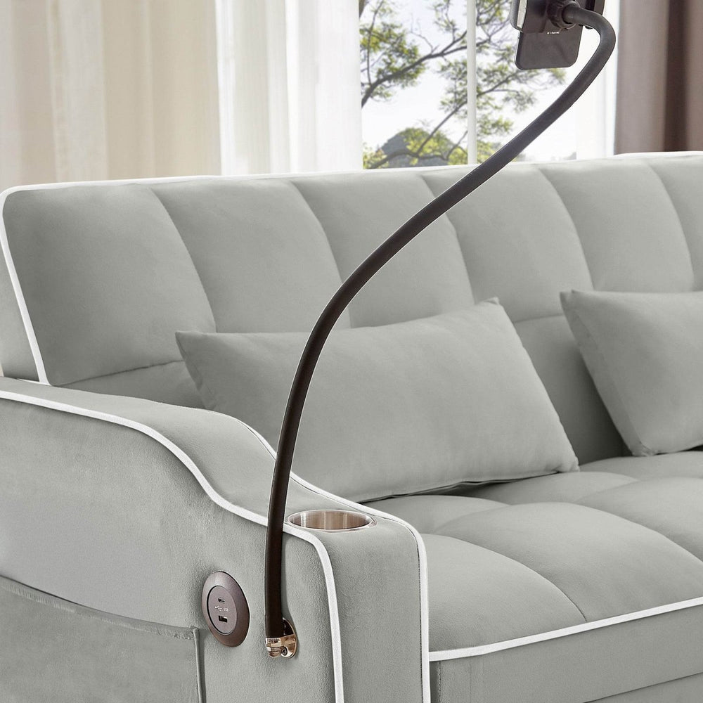 Designed for modern living, this foldable double seat recliner effortlessly converts from a cozy loveseat to a chaise lounge or a full sleeper bed, making it perfect for apartments, studios, and home offices. Upholstered in supple gray velvet and filled with high-density foam, it ensures plush comfort whether you're sitting, reclining, or sleeping. The 3-level adjustable backrest allows personalized positioning from upright sitting to fully flat for restful naps or accommodating overnight guests. Integrated USB and Type-C charging ports keep your devices powered, while the 360° swivel phone stand, cup holders, and side pockets provide convenient storage and hands-free entertainment. Crafted with a sturdy wood and metal frame, this multifunctional recliner combines style, comfort, and practical features to enhance your living space. Elevate your relaxation today with this space-saving, multifunctional sofa bed.