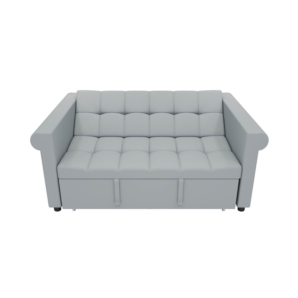 This compact gray velvet loveseat combines elegant design with multifunctional comfort, making it ideal for small living spaces. Upholstered in soft high-density velvet fabric, it offers a smooth, lustrous feel that enhances any room’s aesthetic. The classic scroll arm design adds a timeless charm, while the adjustable backrest with 6 positions plus a full flat recline provides customizable seating for reading, lounging, or sleeping. Easily convert the loveseat into a cozy double bed with the smooth pull-out trundle sleeper—perfect for overnight guests or studio apartments. Thick fiber foam cushions deliver lasting support without sagging, supported by a sturdy espresso-toned wooden frame and metal base for durability. Compact at 69 inches long, 56 inches wide, and 30.7 inches high, this versatile 2-seater is a smart, stylish solution that saves space without sacrificing comfort. Elevate your living area today with this functional and chic sofa sleeper.