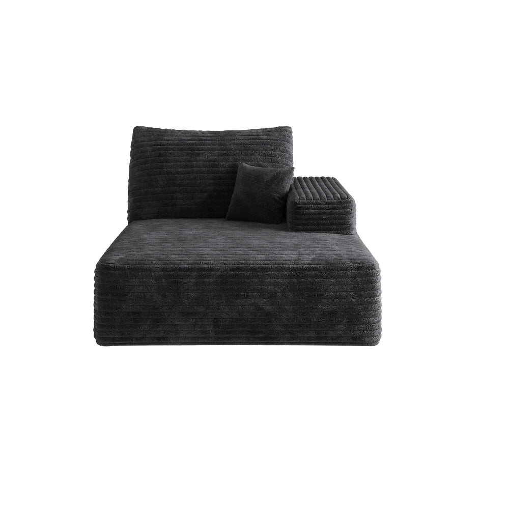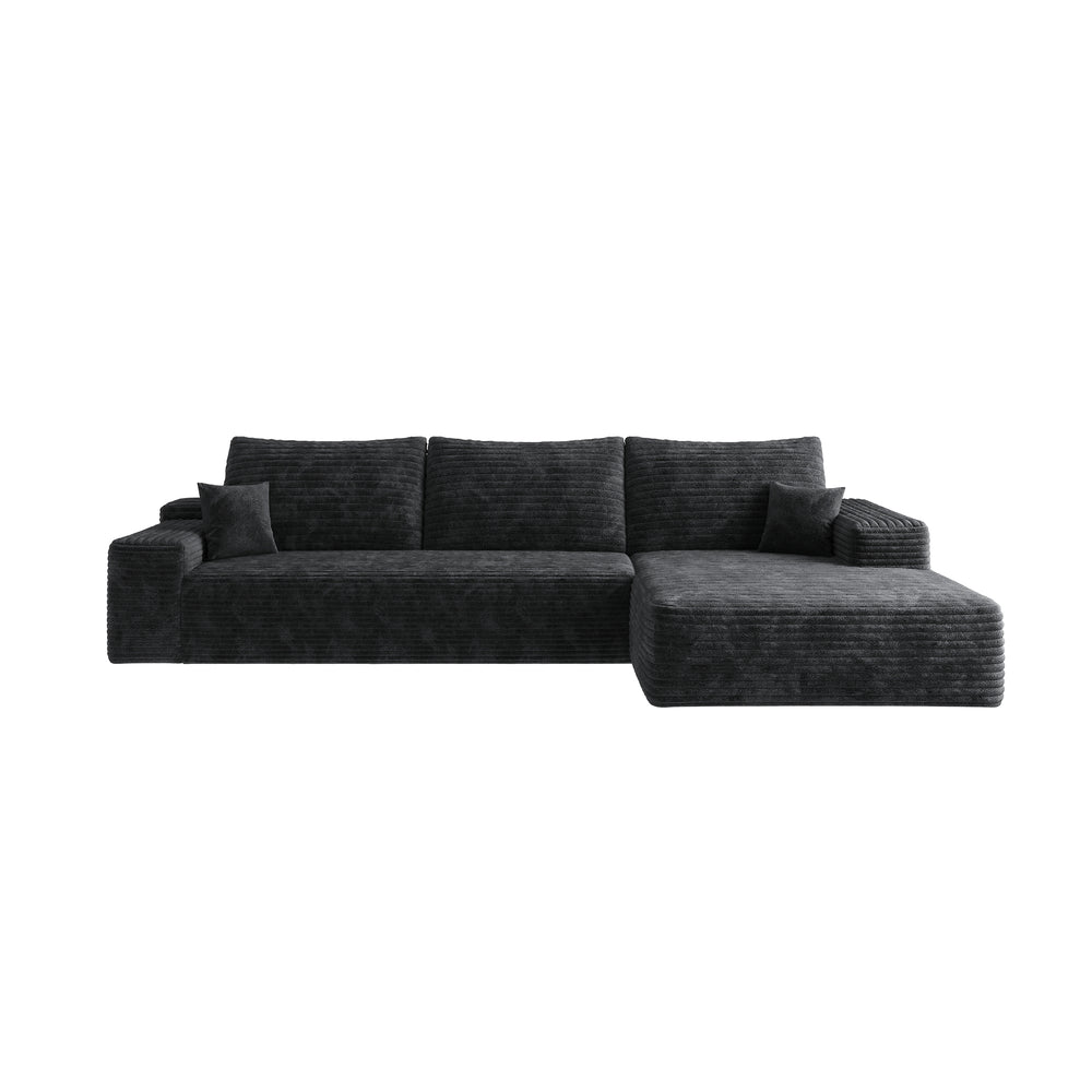 This black modular sectional sofa features plush corduroy upholstery and high-resilience foam cushioning for breathable, cloud-like comfort. Its reversible chaise lounge and no-assembly design make it ideal for living rooms, apartments, and bedrooms seeking stylish, relaxing seating.