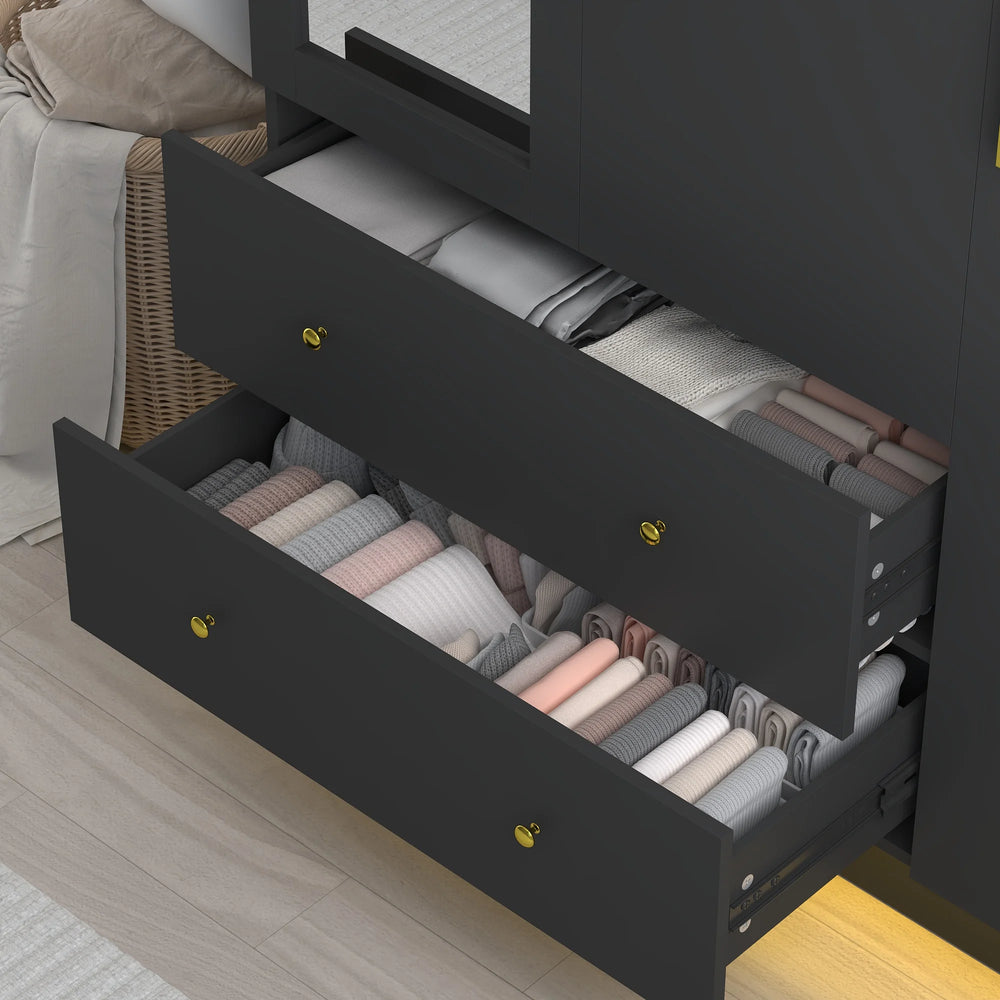 Declutter and refresh your bedroom storage with this stylish 3-door armoire, crafted from high-quality engineered wood. Designed in a minimalist modern style, it features a spacious aluminum alloy hanging rod for your suits and dresses, plus adjustable shelves to organize bedding and essentials. Two large drawers provide added room for personal items, keeping your space neat and tidy. The built-in oversized mirror enhances functionality while adding elegant style, complemented by sleek black finish and gold handles. This wardrobe also includes smart RGB LED lights with 60,000 color options and music-synchronized modes, setting the perfect mood for your room. With safe assembly, cushioned hinges, and floor-protecting pads, this versatile wardrobe combines durability and convenience. Elevate your bedroom storage and ambiance today.