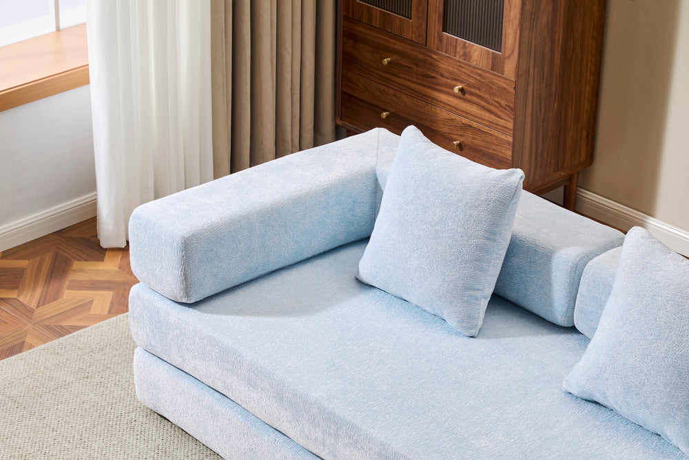 Maximize your living space with this stylish and functional floor couch, expertly designed to transform from a cozy 3-seat sofa into a comfortable mattress in seconds. Upholstered in soft, breathable chenille fabric, it offers plush seating that is both durable and easy to maintain. The high-quality memory foam filler provides excellent support and cushioning whether you’re lounging, reading, or sleeping. Its foldable armrests and backrest enable quick conversion, making it perfect for small apartments, dorm rooms, or multipurpose living areas. At 76.8 inches long by 37.4 inches wide, it provides ample room for relaxation without overwhelming your space. Lightweight yet sturdy at just under 75 pounds, this compression sofa invites enjoyment from daytime comfort to overnight guests. Elevate your home lounge experience today with this convertible futon couch in a refreshing light blue hue.