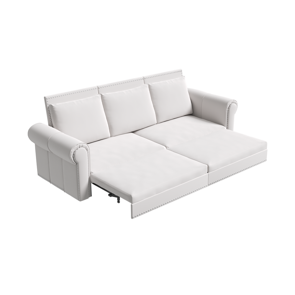 Discover the perfect blend of style, functionality, and comfort with this 93.7-inch velvet sleeper sofa. Crafted with soft, smooth velvet upholstery and plush high-density sponge cushions, it offers a luxurious seating experience by day and transforms effortlessly into a king-size bed by night. The innovative pull-out design provides two length options: a cozy chaise lounge when partially extended, and a spacious sleeper ideal for guests or children when fully opened. Elegant nailhead trim and classic rolled arms add a timeless Chesterfield charm that enhances any living room, bedroom, apartment, or office space. Built on a strong iron and plywood frame with reinforced steel tubing, this sofa bed supports up to 300 lbs per seat while maintaining stability and durability. Removable cushions and covers simplify cleaning and maintenance. Elevate your home’s comfort and versatility today.