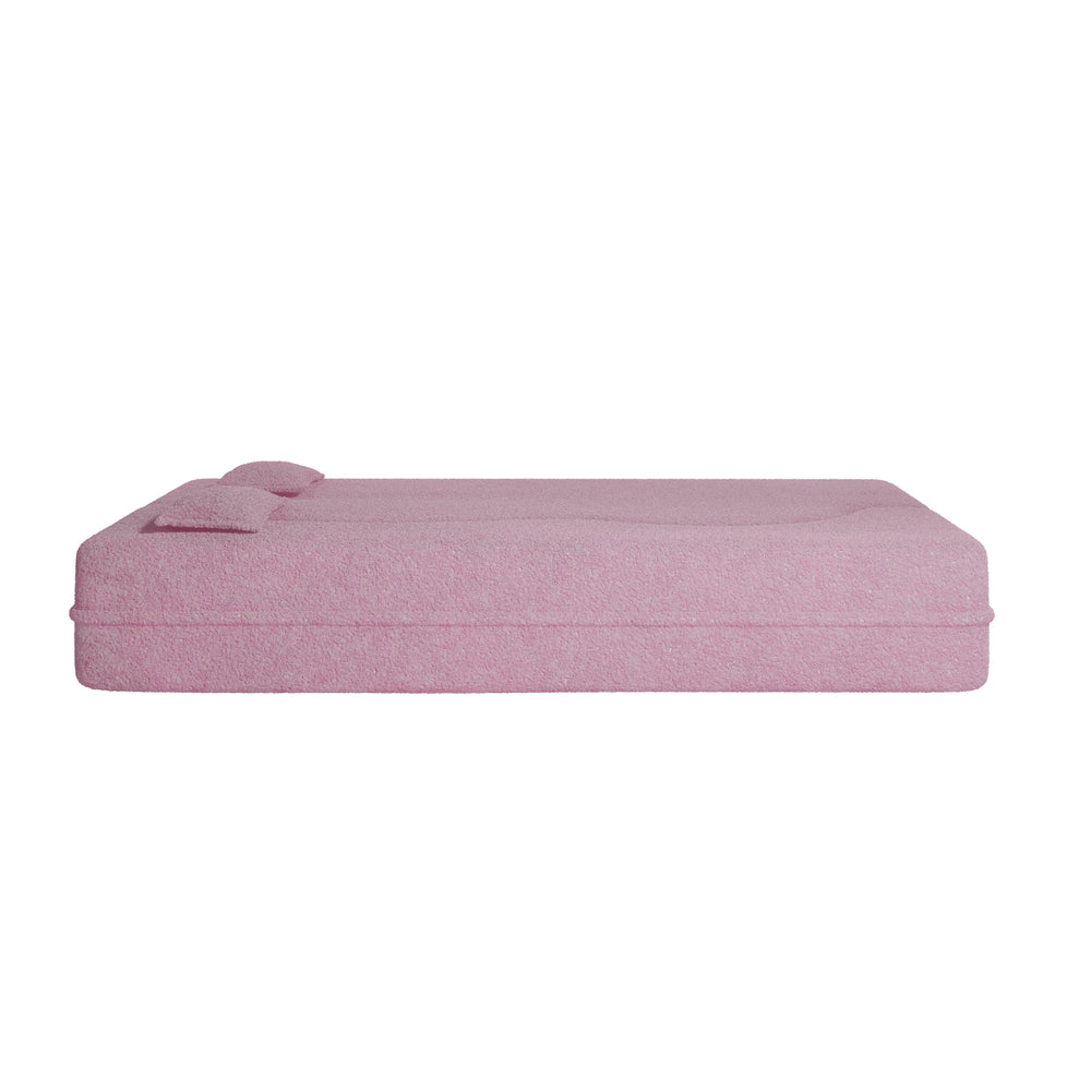 Full size folding sofa bed features soft, breathable teddy fabric and foam support for comfort and durability. Its 3-tier multifunctional design folds into a lounge or guest bed, includes two pillows, requires no assembly, ideal for small spaces and playrooms.