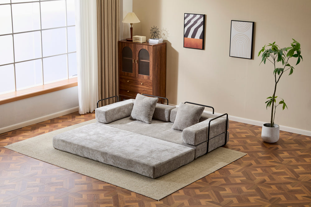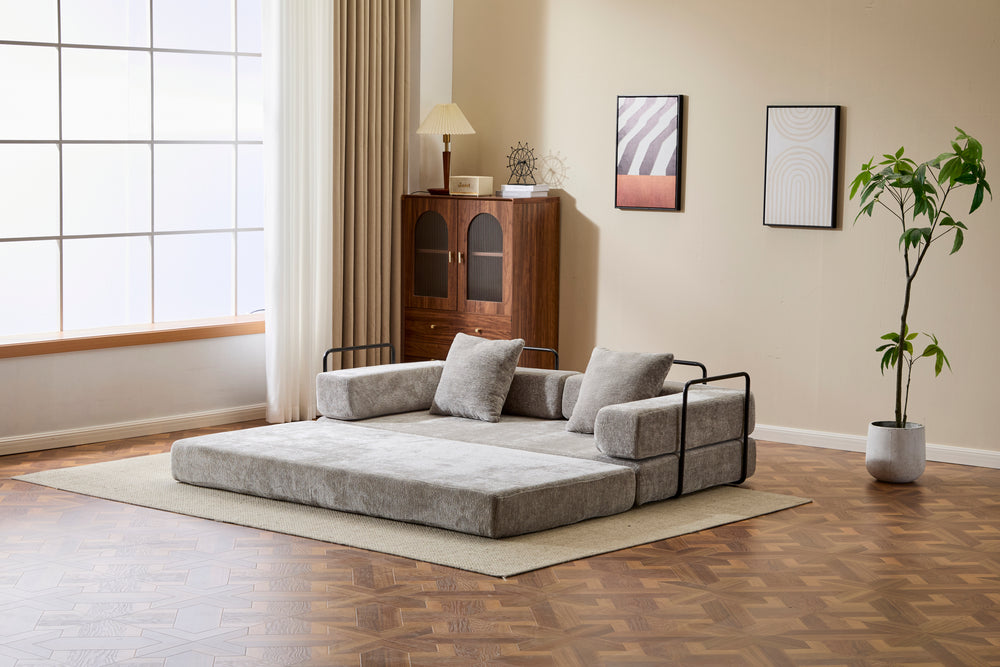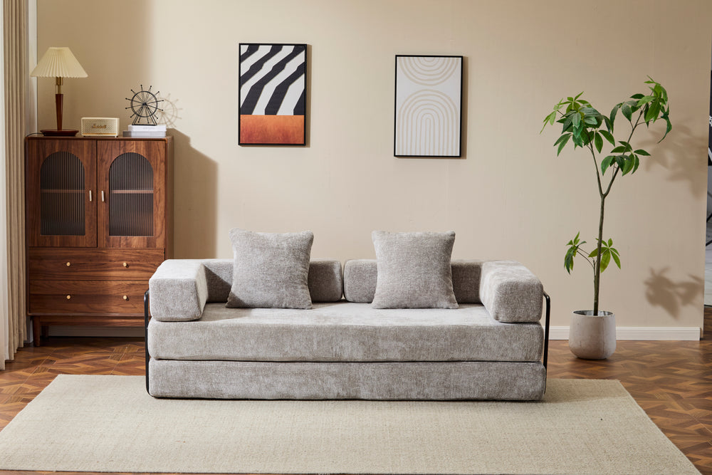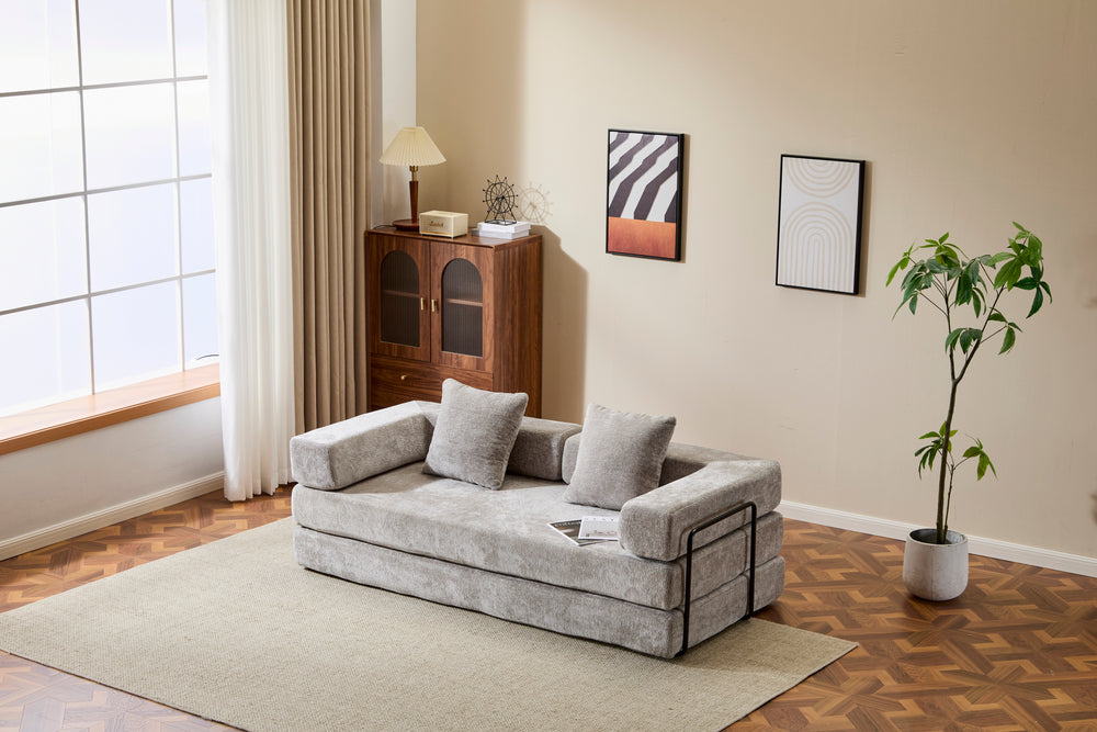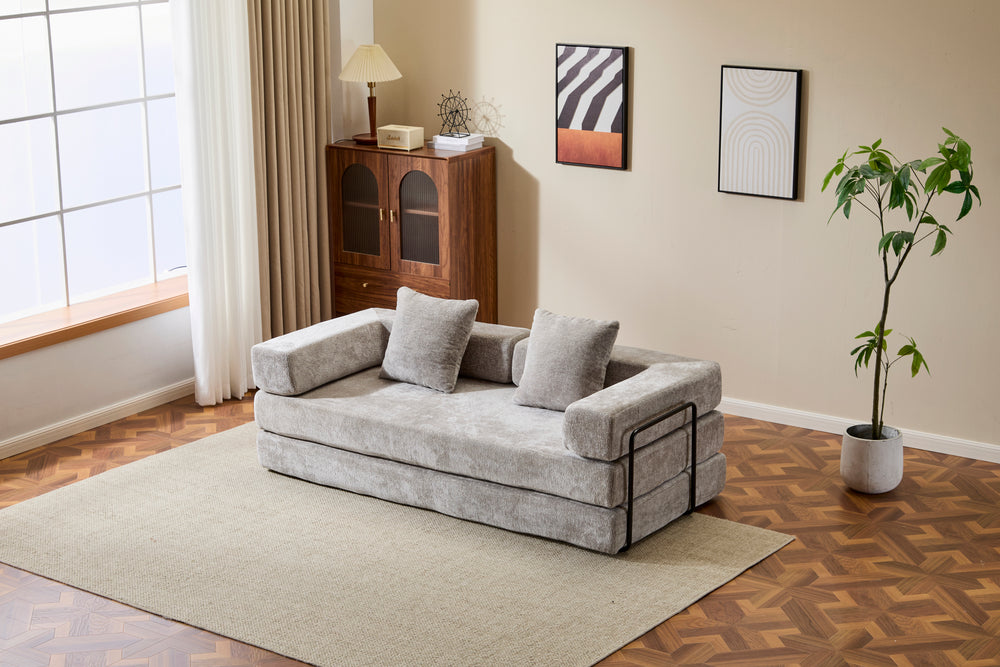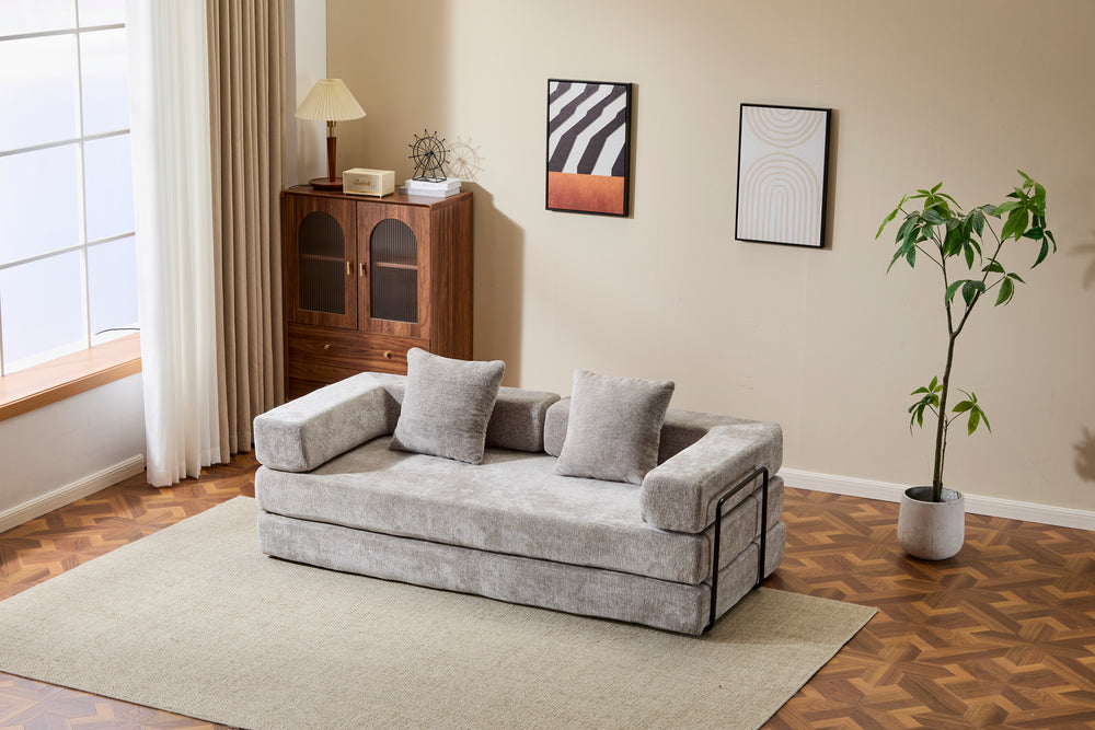 Upgrade your living space with this multi-functional floor couch that effortlessly transforms from a supportive 3-seat sofa into a cozy sleeper bed. Crafted with soft, breathable chenille fabric and filled with high-quality memory foam, it offers plush comfort whether you're lounging, playing games, or hosting overnight guests. Its foldable design with pillow back support and armrests saves space while providing ergonomic support. Perfect for small apartments, bedrooms, or game rooms, this compression sofa combines style and functionality in one compact piece. Easy to clean and requiring no assembly, it expands fully within 72-96 hours for optimal comfort. Elevate your relaxation and seating options today.