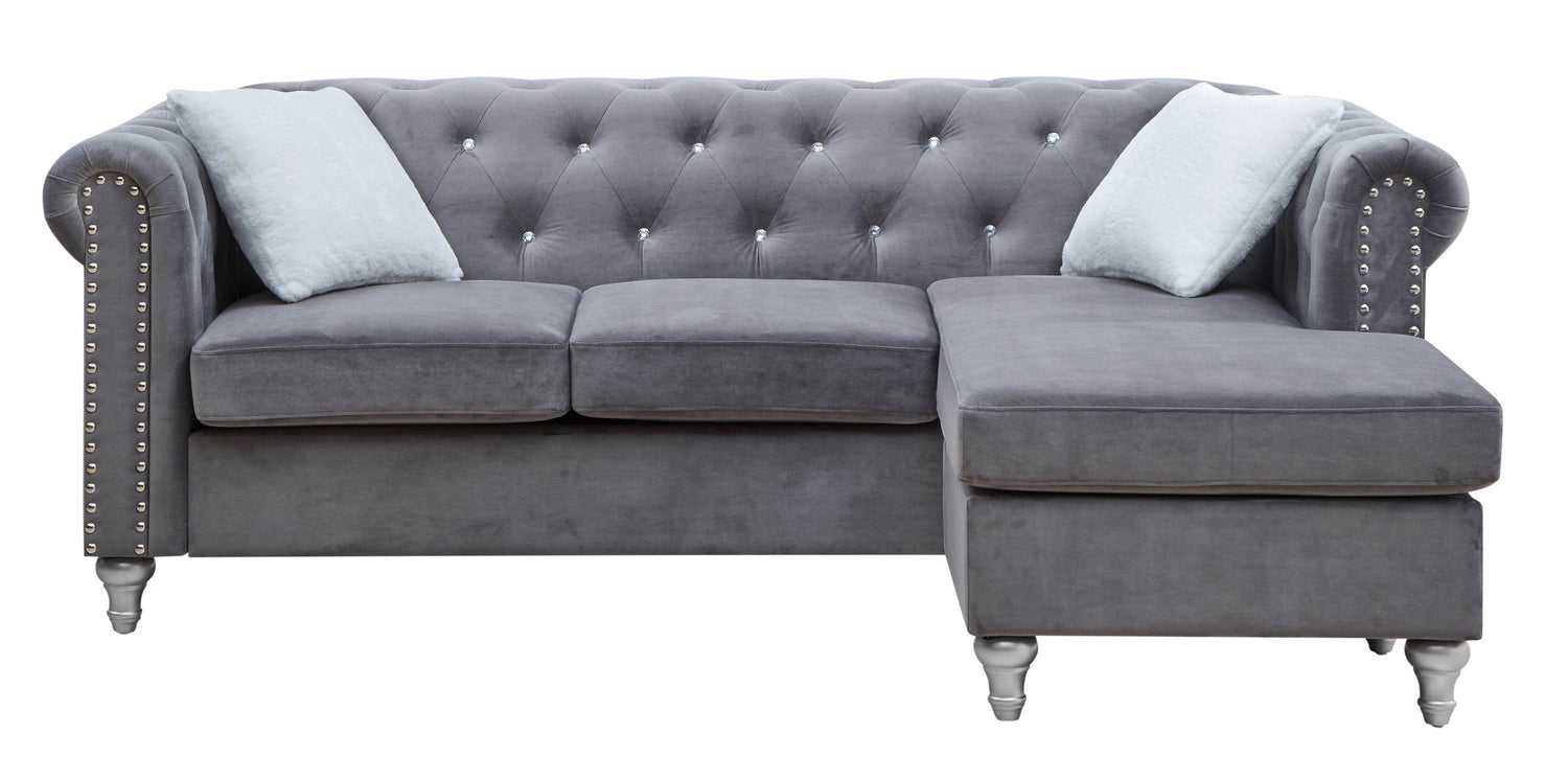 Draped in soft gray velvet with faux jewel tufting, this 4-seat chaise features welted cushions with pocketed coil springs and durable turned wood legs, offering stable, supportive comfort and sophisticated style ideal for living room relaxation.