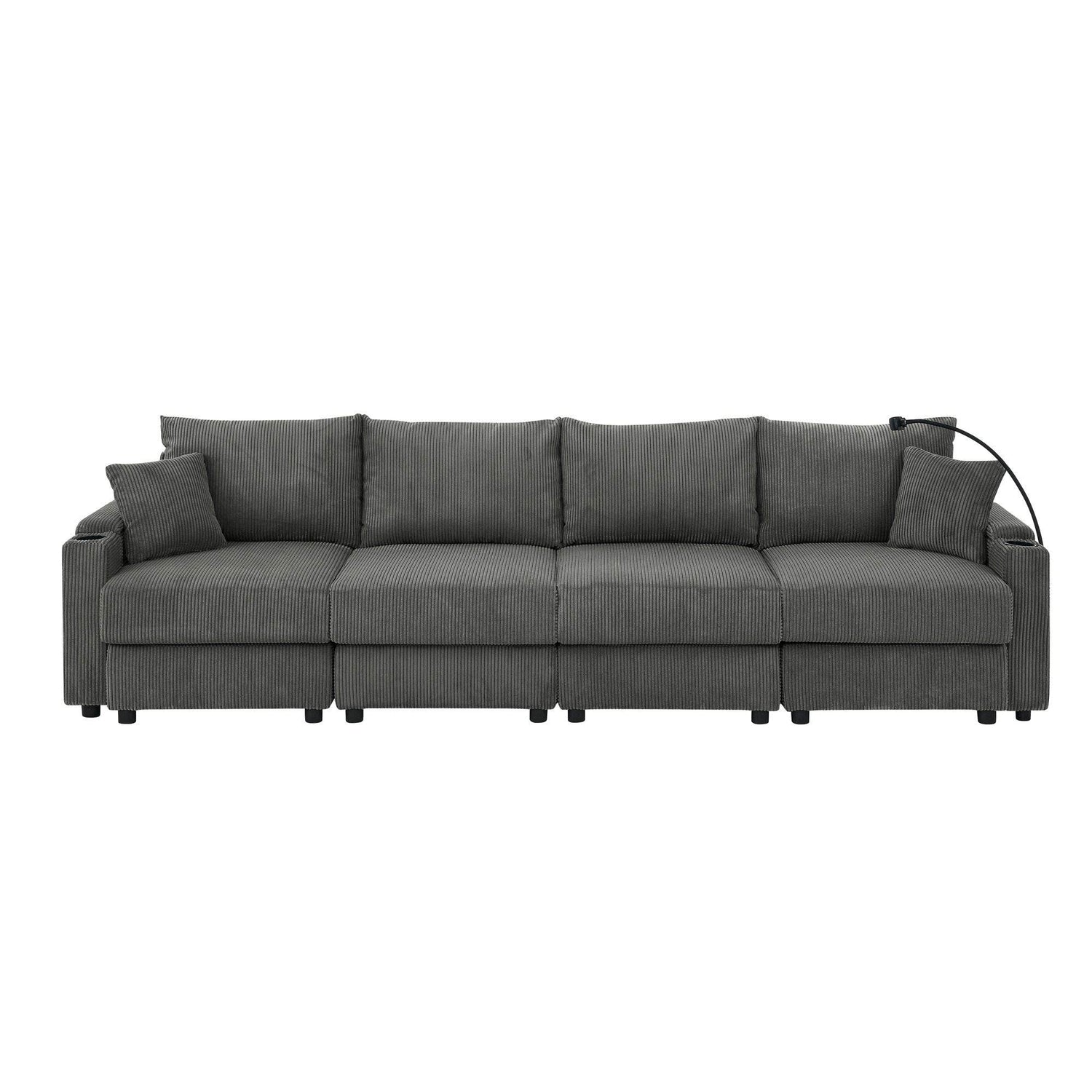 Upgrade your living space with this stylish and functional 4-seat sofa, crafted for everyday comfort and modern living. Upholstered in breathable grey corduroy, its medium-soft cushions offer plush support perfect for relaxing or entertaining guests. The generous 22.5-inch deep seats combined with fiber foam and polyester padding ensure optimal full-body comfort. Built on a sturdy wood frame, this armless sofa features a cushion back for additional support, while integrated cup holders and phone charging ports keep essentials within reach. Its sleek lines and contemporary design make it an elegant centerpiece in any primary living area. Enjoy a perfect blend of style, durability, and convenience—elevate your relaxation today.
