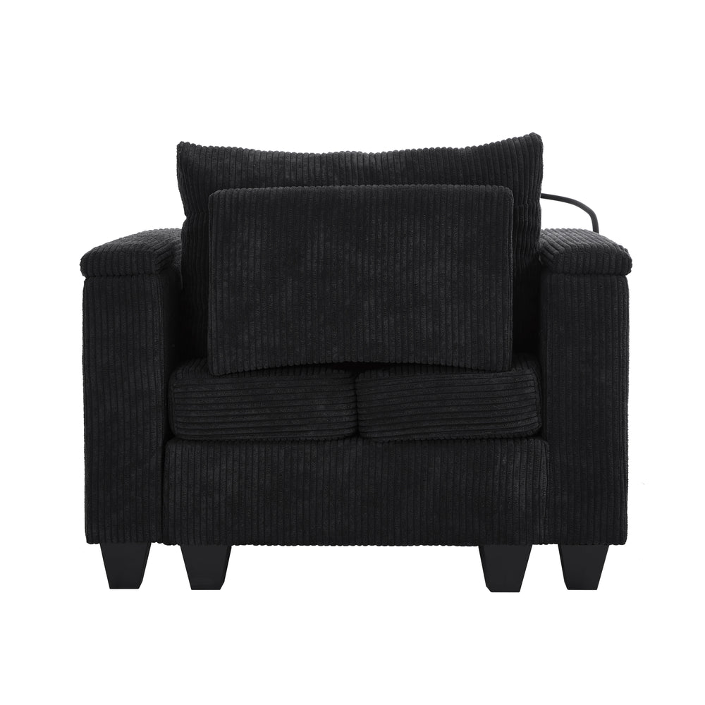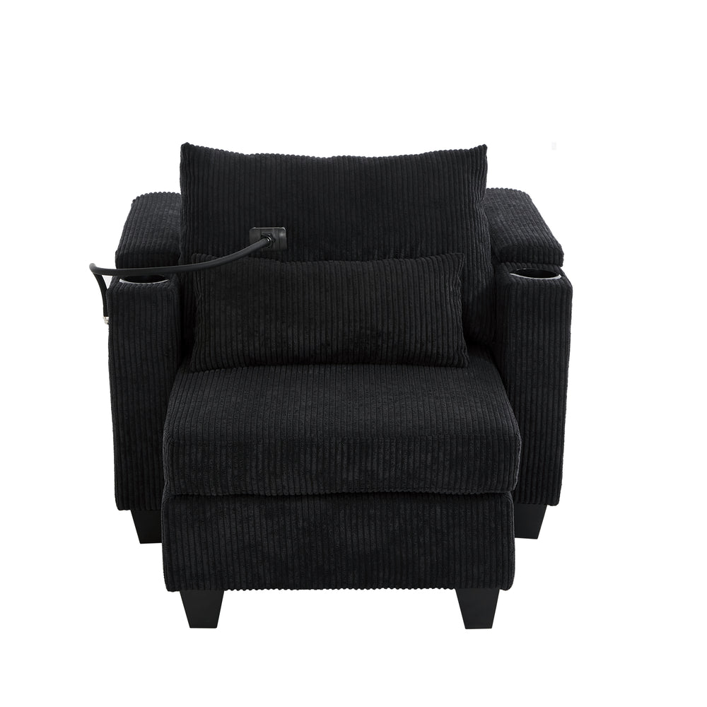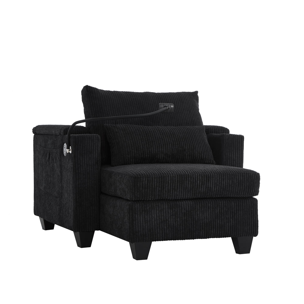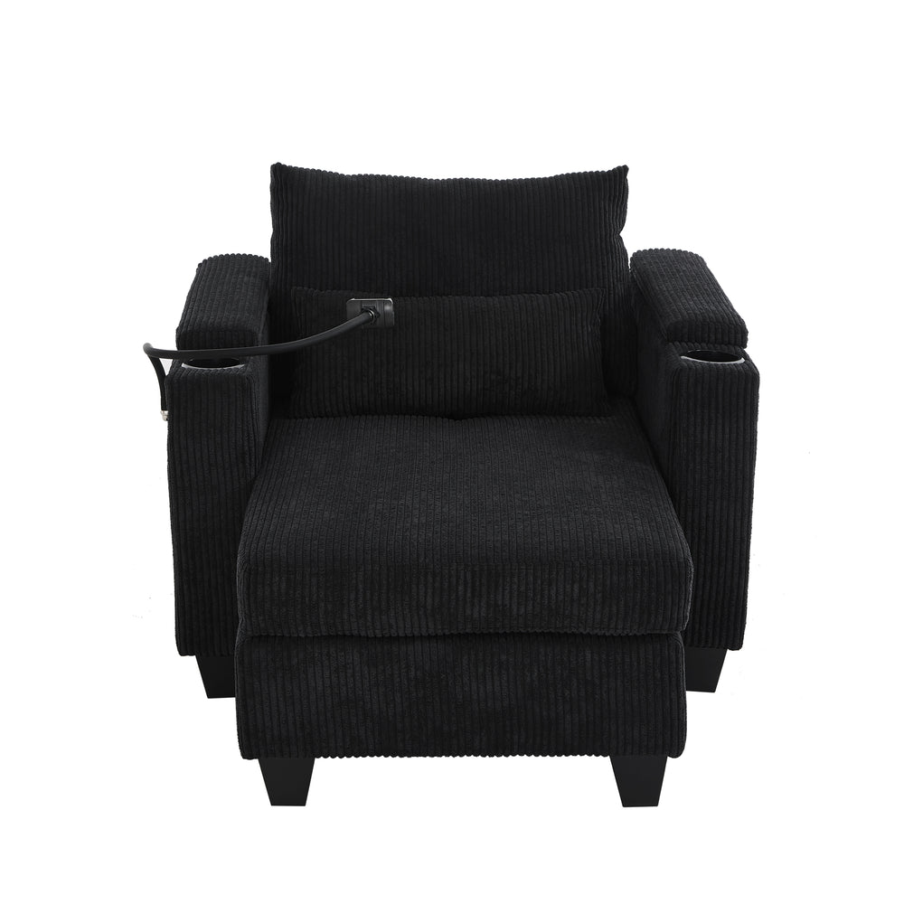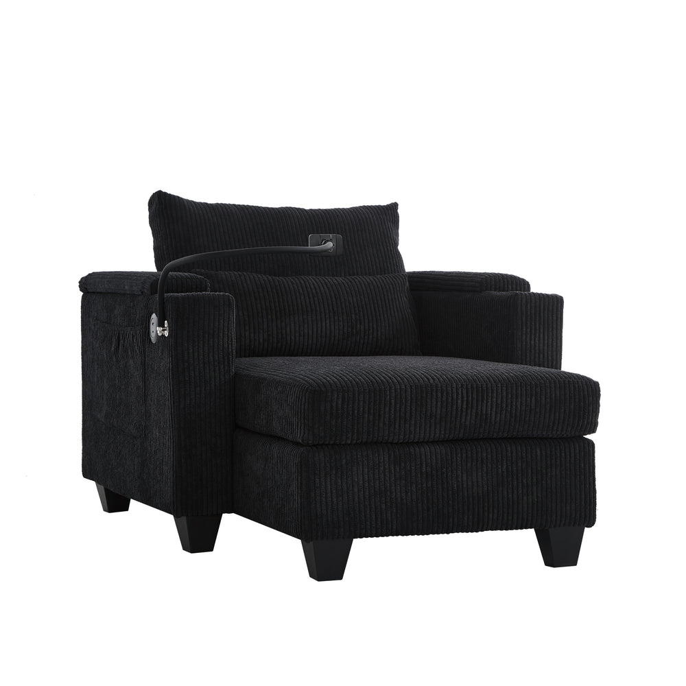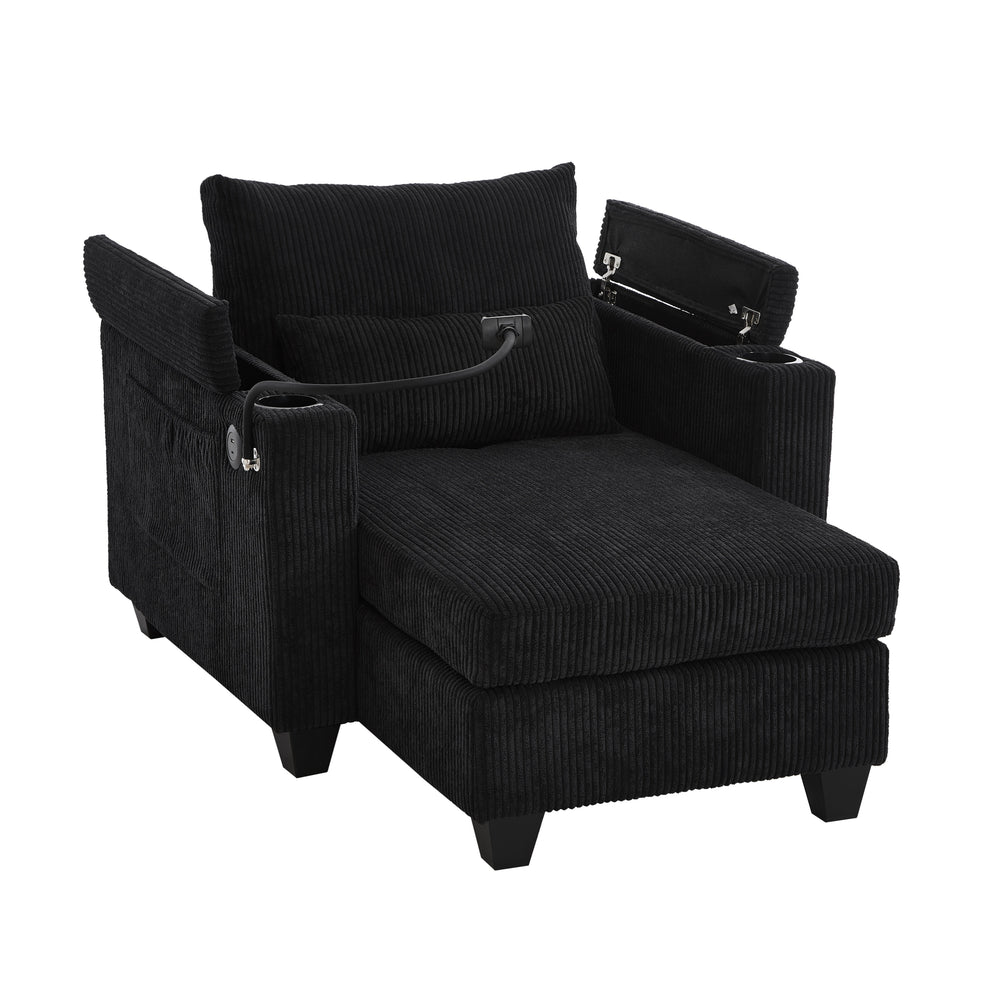 Maximize your living space with this innovative convertible chaise lounge sofa chair, designed to effortlessly switch between a spacious chaise lounge and a comfortable sofa chair. Upholstered in soft black corduroy fabric, it offers a plush texture that invites relaxation and adds a stylish retro flair to any room. The durable plywood frame and pocket spring plus foam seat construction ensure supportive comfort for daily use. Built-in USB charging ports and a flexible phone holder keep your devices powered and accessible, perfect for modern lifestyles. Thoughtful features like hidden storage compartments in the armrests, integrated cup holders, and side storage pockets keep essentials within easy reach while keeping your space organized. Comes with a supportive lumbar pillow to enhance your posture during extended lounging. Ideal for compact apartments or multifunctional spaces, this convertible sofa blends functionality with style. Elevate your relaxation and living area efficiency today.