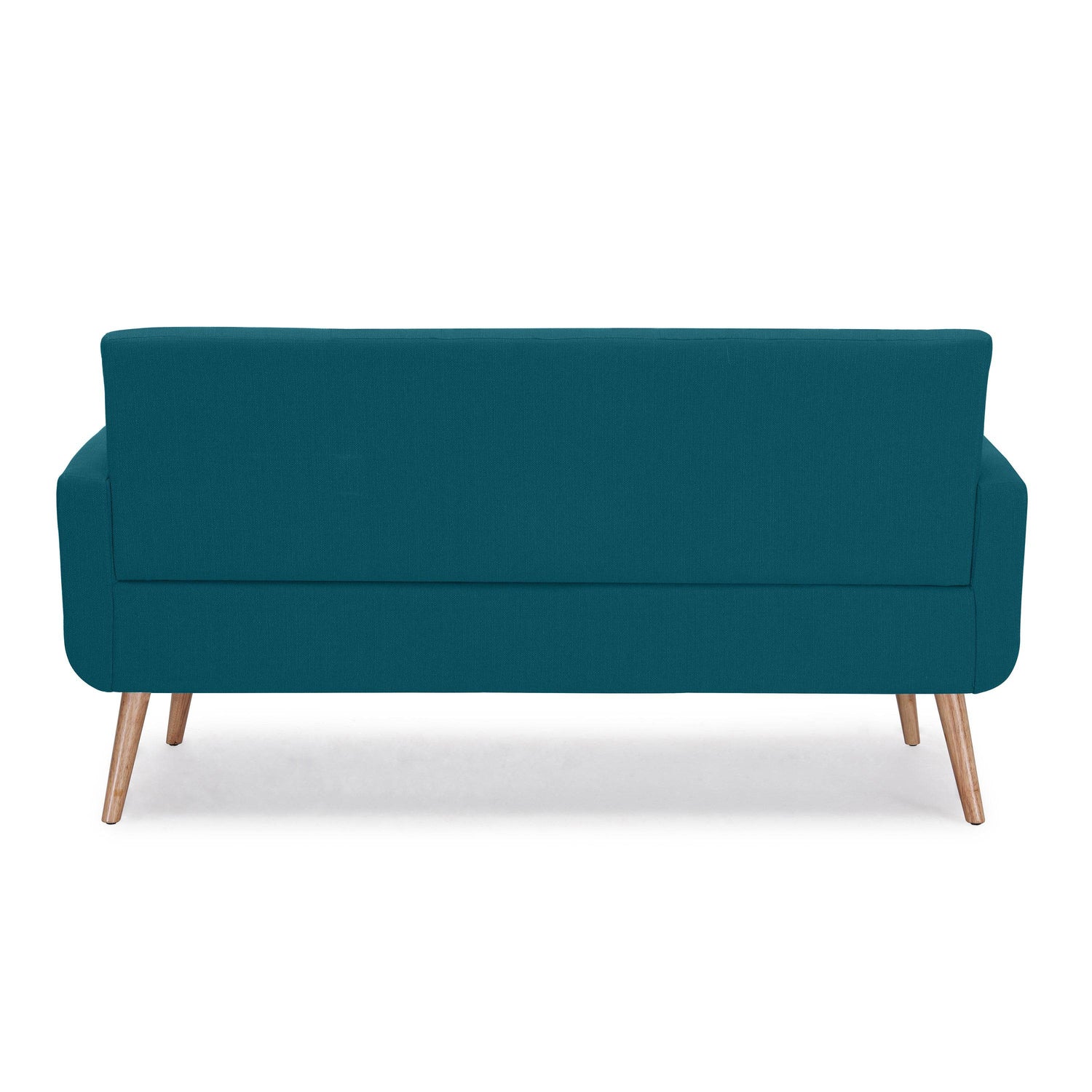 Mid-century modern blue-green sofa features durable polyester fabric, solid poplar wood legs, and a plush foam cushion with sinuous springs and pocketed coils for firm yet cozy seating. Easy to clean and quick to assemble, ideal for stylish small spaces.