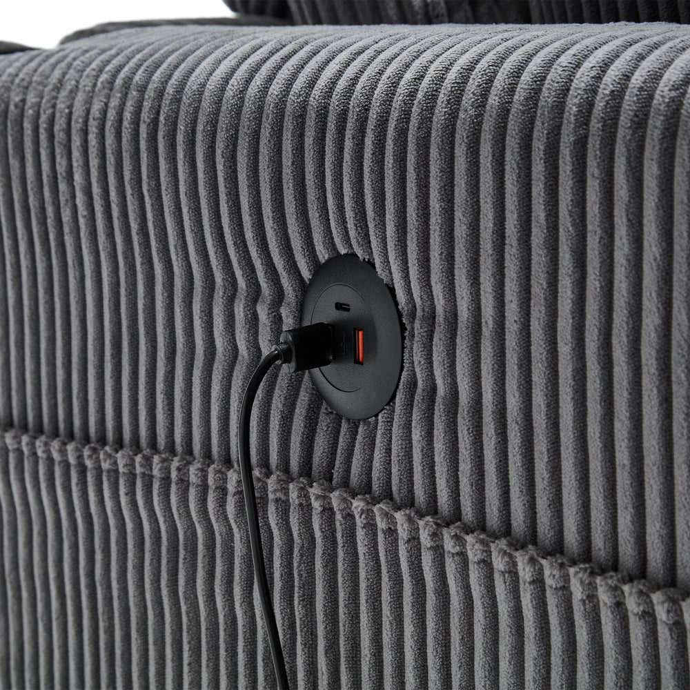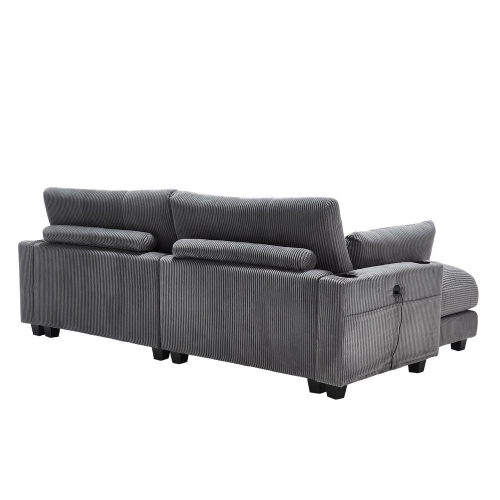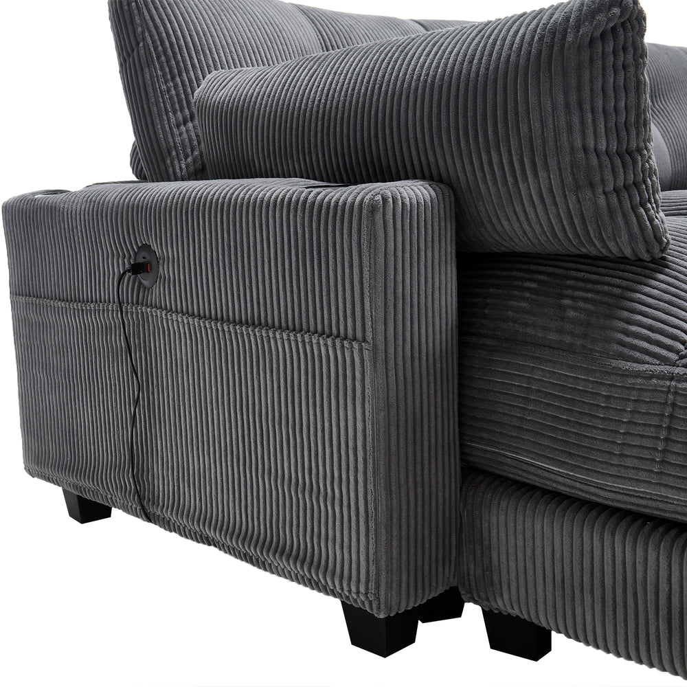 Transform your living space with this multifunctional oversized chaise lounge chair that effortlessly converts into a cozy sleeper sofa. Upholstered in soft, durable gray corduroy, this versatile piece offers warmth and comfort for lounging or restful sleep. Designed for single seating, it impresses with thoughtful features like a USB charging port and cup holders, ensuring convenience without disrupting your relaxation. The adjustable backrest pillow and switchable single armrest provide personalized comfort and flexible arrangement options to suit any room layout. Side pockets keep your essentials close, making this sofa bed perfect for living rooms, bedrooms, or guest spaces. Whether unwinding after a long day or accommodating overnight guests, this cozy cloud couch combines style, function, and comfort to redefine your home experience. Elevate your relaxation and space versatility today.