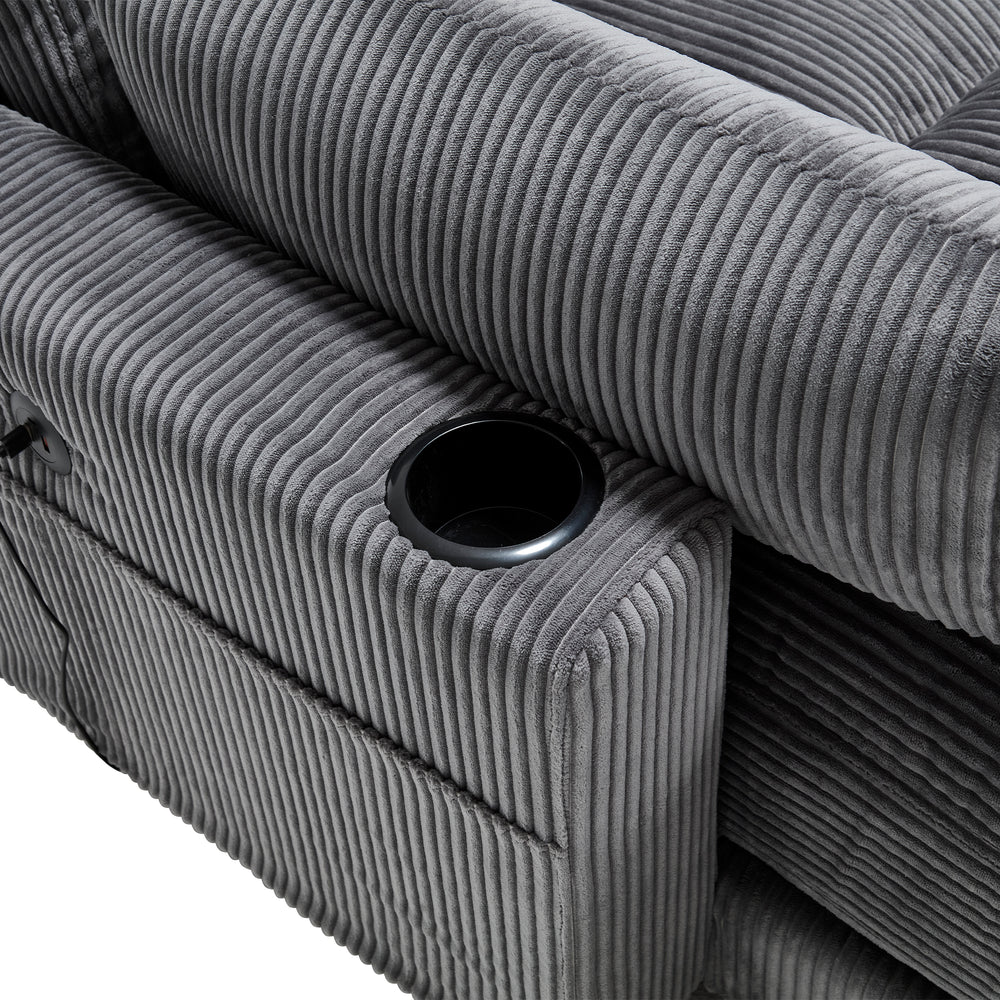 This gray corduroy sofa bed features a switchable single armrest, adjustable backrest pillow, built-in USB charging port, and dual cup holders, offering cozy warmth, flexible placement, and convenient storage for enhanced relaxation in living rooms or bedrooms.