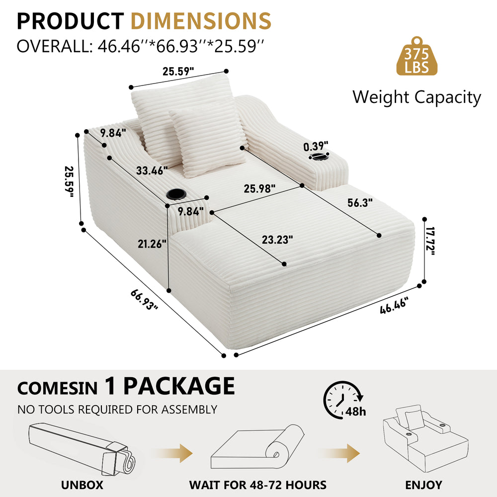 Relax and unwind in style with this 67-inch chaise lounge sofa bed, designed to bring comfort and functionality to your living space. Its oversized deep seat invites you to stretch out fully or curl up snugly, while the wide 9.9-inch armrests provide generous room for resting or placing your essentials. Upholstered in soft, durable white corduroy fabric, this indoor sleeper offers year-round coziness complemented by two plush accent pillows for added support. The boneless design combines high-resilience foam and responsive spring coils for adaptive comfort that contours to your body while maintaining firmness. Delivered compressed and vacuum-sealed, it requires no assembly—just unbox and enjoy within 72 hours as it expands to full size. Whether used as a stylish lounge or a convenient twin-size bed, this American-designed sofa effortlessly enhances your primary living space. Elevate your relaxation today.