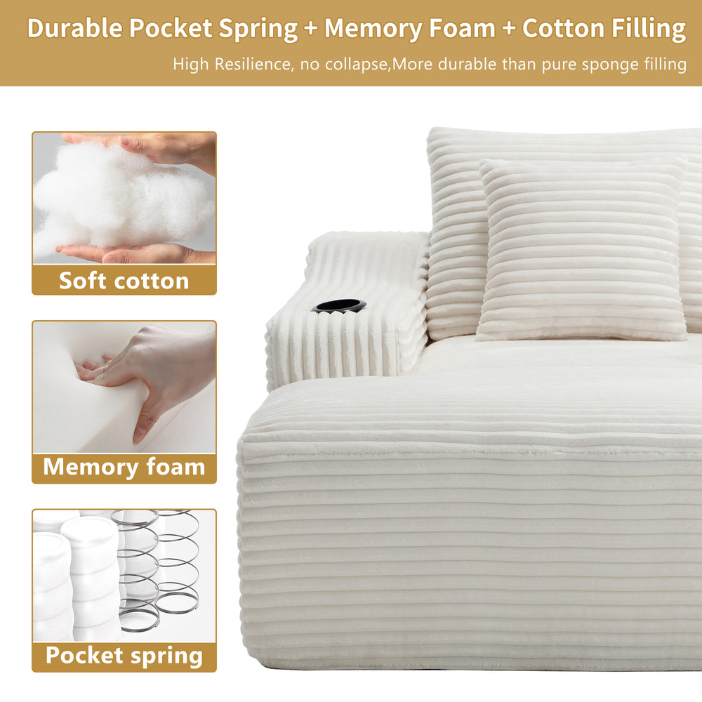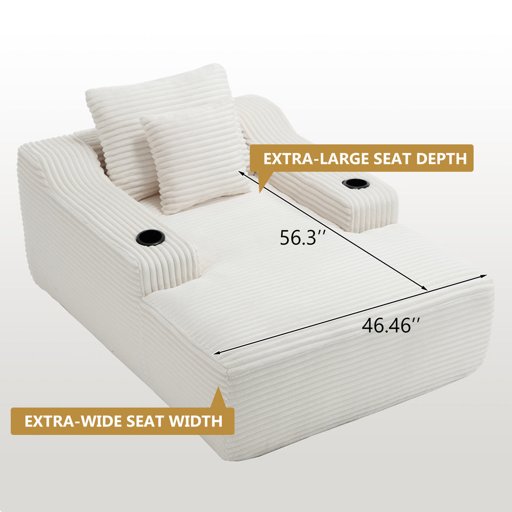 This oversized sleeper sofa features a deep corduroy fabric seat and wide armrests with cup holders for relaxation and convenience. Filled with fiber foam and spring coils, it offers durable, comfortable support without assembly, ideal for primary living spaces.