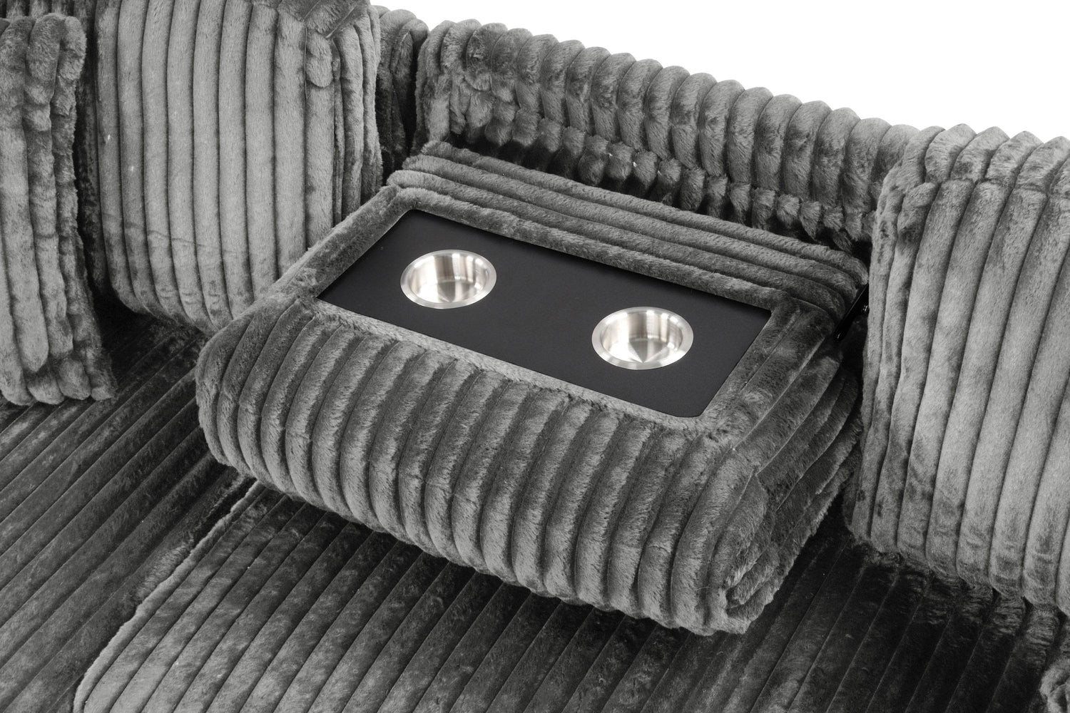 Plush sectional sofa features soft velvet upholstery with a plush, ribbed texture, reversible chaise with hidden storage, dropdown tray with cup holders, integrated USB ports, and a pull-out sofa bed, offering versatile comfort and convenience for modern living spaces.