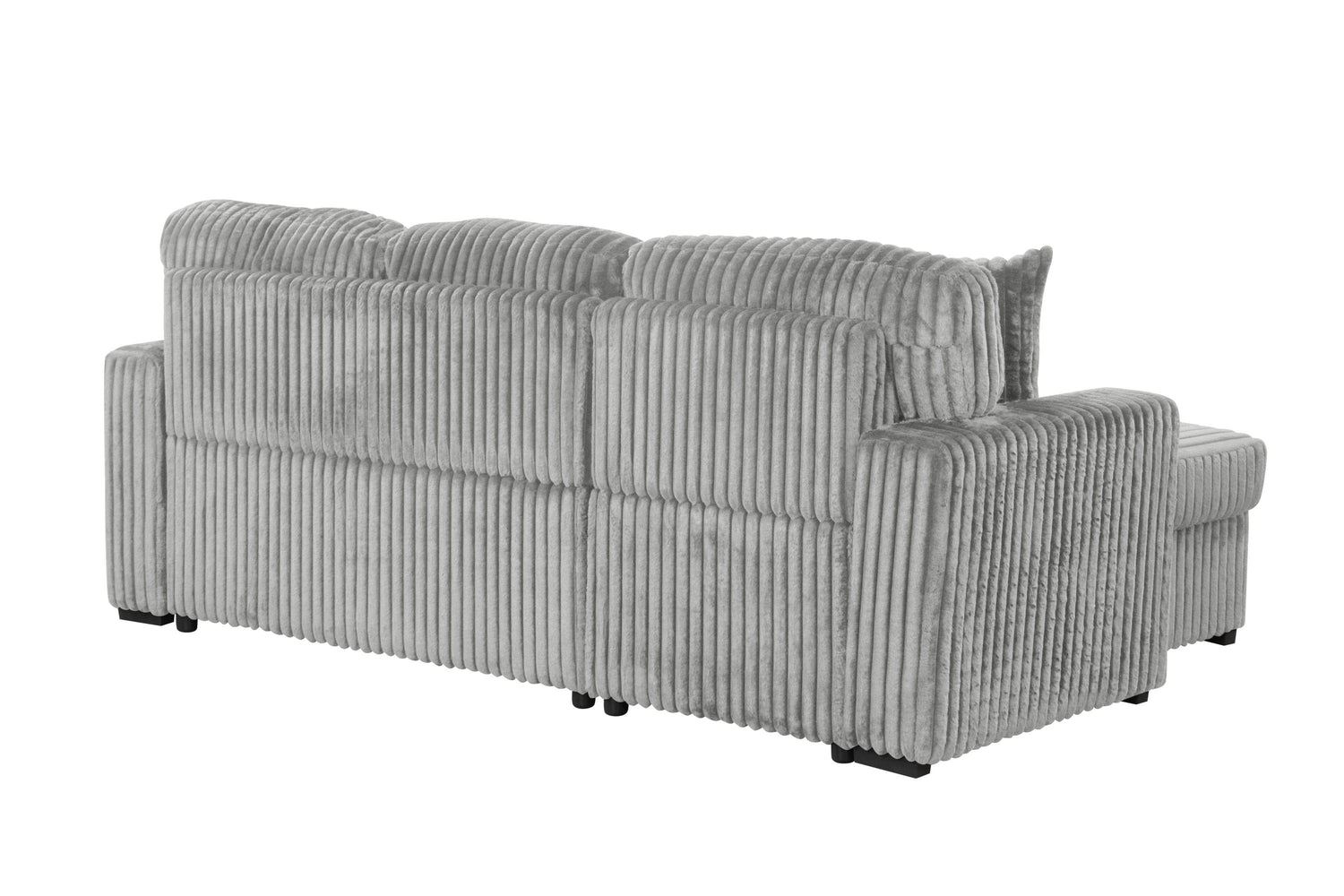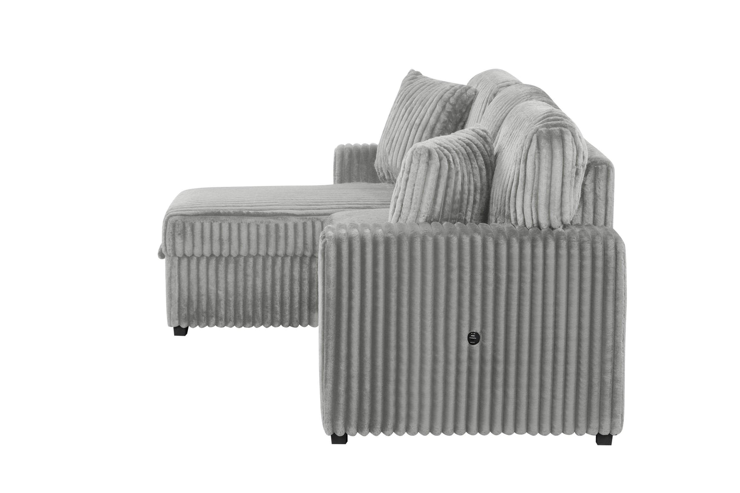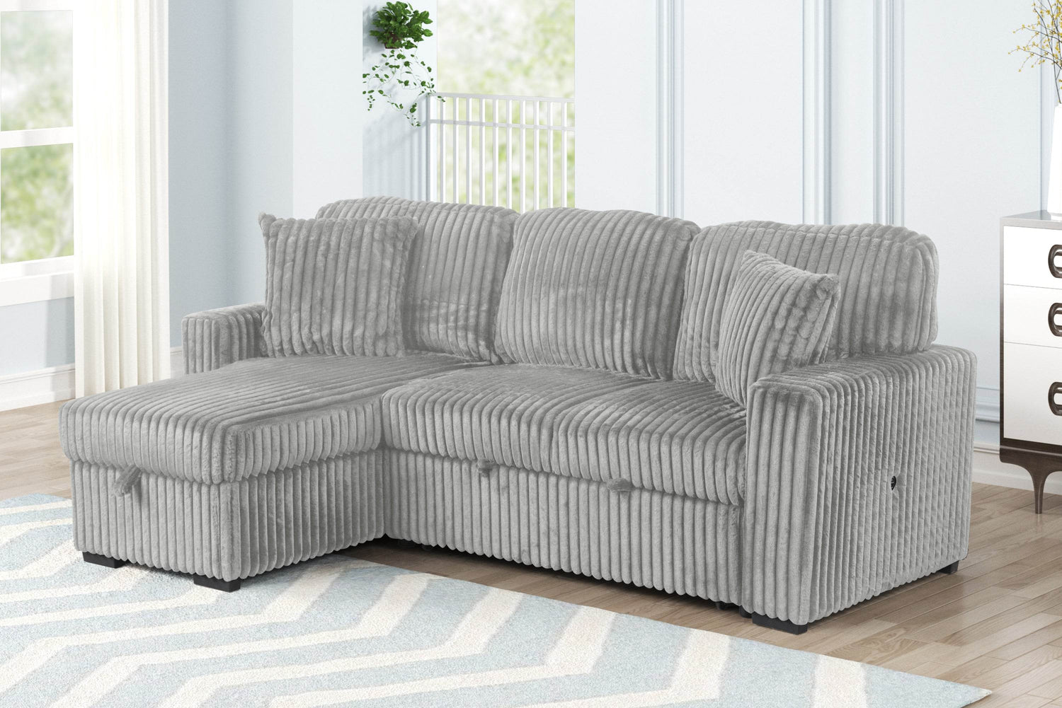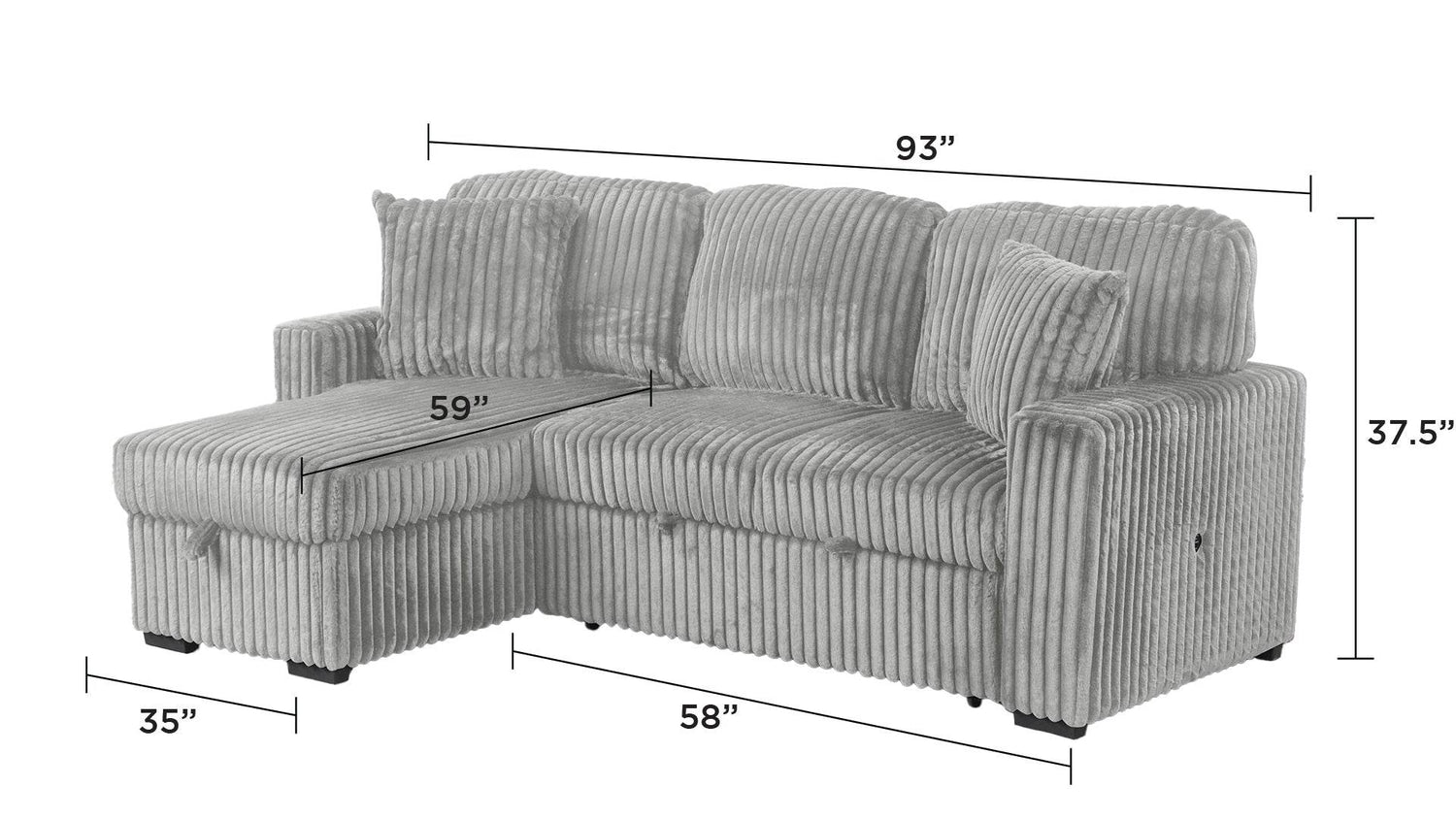 Upgrade your living space with this modern gray plush sectional sofa, crafted with soft velvet upholstery that invites you to sit back and relax. Its medium-firm polyurethane foam cushions provide exceptional comfort and support, making it ideal for family gatherings or quiet evenings. Designed with rolled arms and a pillow back, this L-shaped sectional offers a stylish and cozy seating arrangement for up to three people. The reversible chaise adds versatile layout options while hiding ample storage for blankets and pillows. Easily convert this sofa into a pull-out sleeper bed, perfect for accommodating overnight guests. Integrated USB ports keep your devices charged, ensuring convenience without interruption. Robust wood and acacia frame construction guarantee durability paired with elegant aesthetics. Measuring 59 inches wide by 93 inches long and standing 39.5 inches tall, this heavy-duty sectional is built to last while elevating your home style. Elevate your relaxation today with this all-in-one modern sectional sofa.