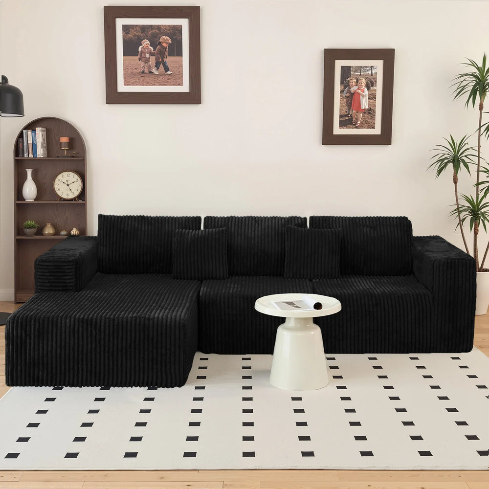 Relax in style and versatility with our Modern Cloud Sectional Sofa, featuring an L-shape chaise and deep seating wrapped in plush black corduroy upholstery. Crafted with soft long-pile corduroy fabric, this modular sectional invites you to sink into cozy comfort while effortlessly adapting to your living space. The boneless, three-piece design allows easy rearrangement—from a spacious sofa to a lounge-ready chaise or even a sofa bed—making it perfect for family gatherings, movie nights, or quiet afternoons. Packaged in two boxes and requiring no assembly, it’s ready to transform your home with sleek American design and lasting durability. Elevate your living area with unmatched softness and customizable form today.