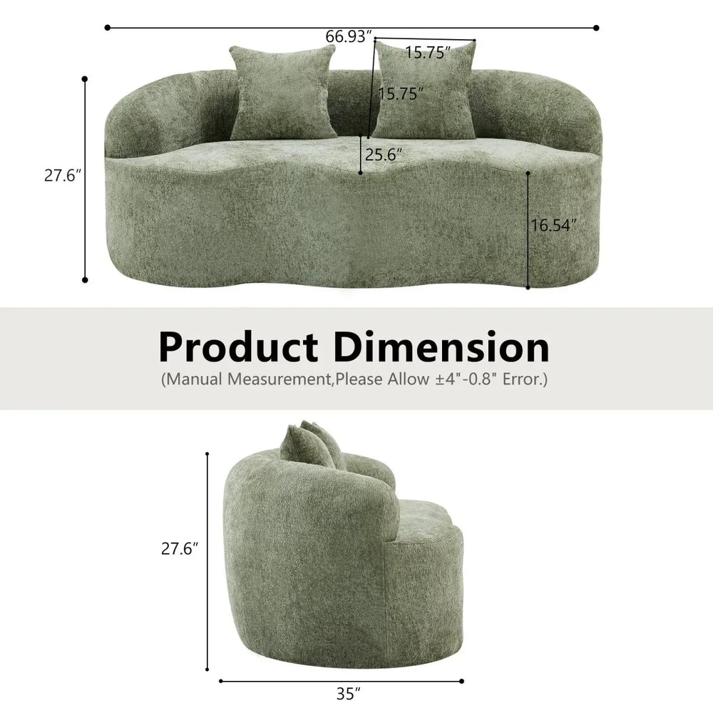 Enhance your living space with this stylish green curved loveseat, designed for both comfort and elegance. Upholstered in soft chenille fabric, it offers a plush sitting experience with high-density foam and spring filling that perfectly balances support and softness. Its minimalist shape with round armrests seamlessly complements any room, from cozy bedrooms to lively living rooms or compact offices. The compact dimensions—approximately 67 inches long by 35 inches wide and 28 inches high—make it an ideal choice for small spaces without compromising seating comfort. Ready to use with no assembly required after a brief 72-hour spring back period, this loveseat combines convenience with sophistication. Elevate your home seating experience today and enjoy a perfect blend of design and function.