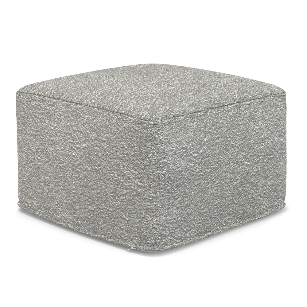 Omega Lifestyles square pouf ottoman features a light gray boucle fabric with polystyrene EPS ball filling for comfortable seating and support. Its lightweight, durable cotton/polyester construction suits living rooms or reading nooks, enhancing relaxation and modern décor.
