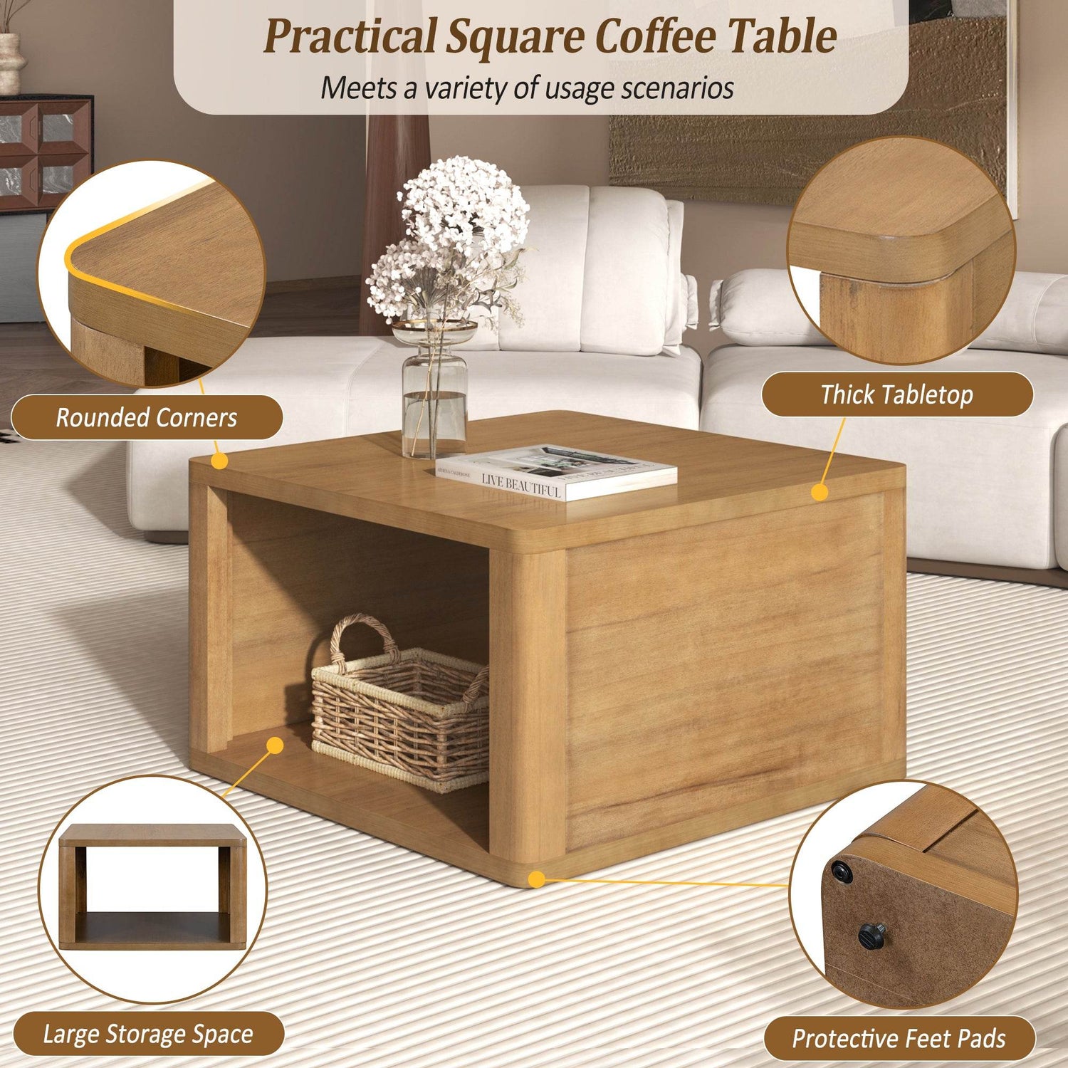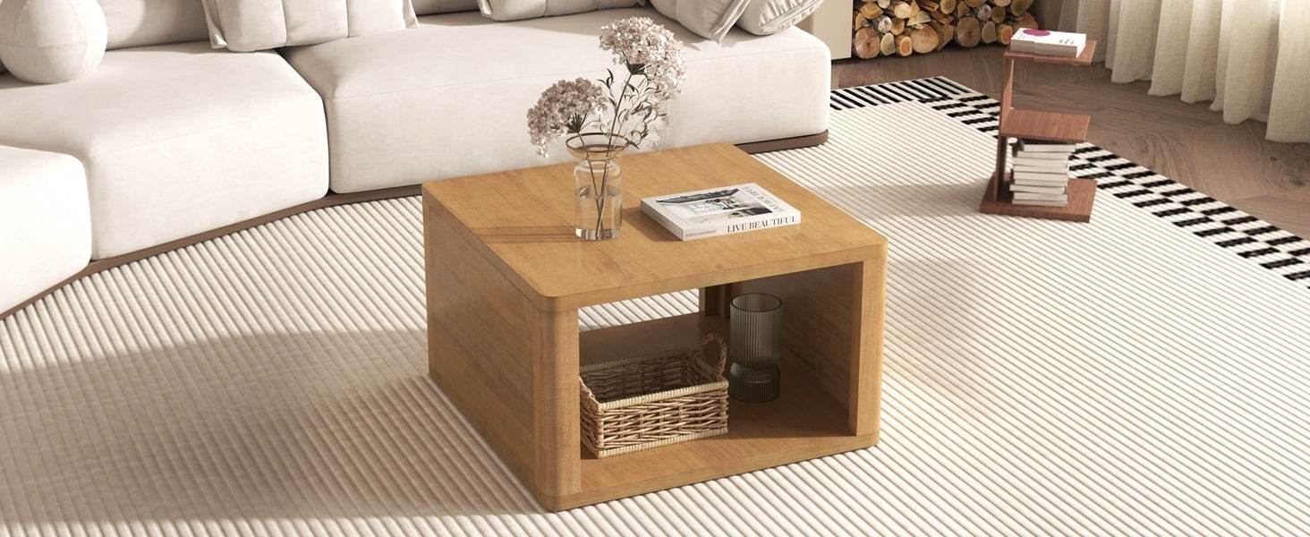Square farmhouse coffee table features durable MDF and acacia wood construction with a natural finish. Its 2-tier and half-open storage compartments offer organized space for living rooms, while rounded corners and protective feet pads enhance safety and floor protection.