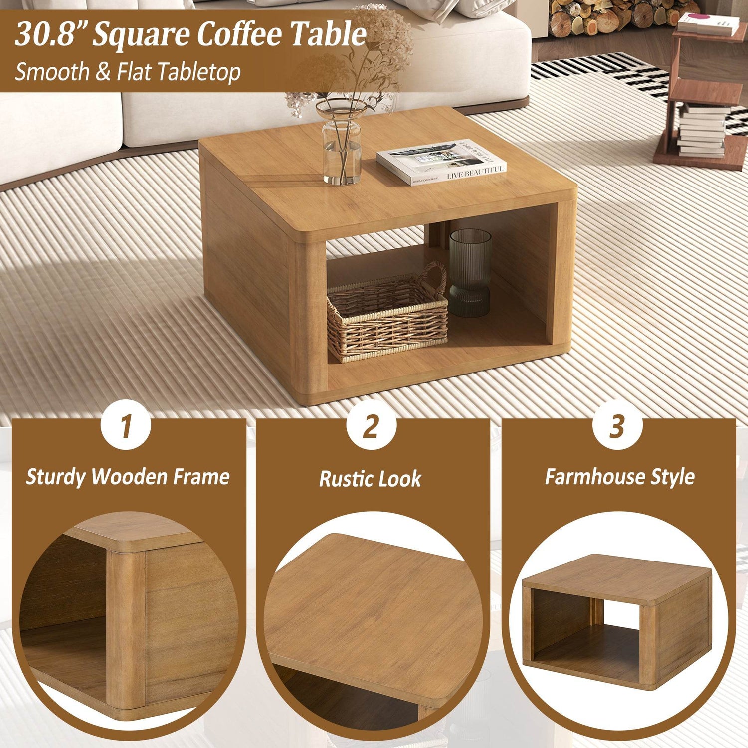 Bring rustic charm and practical storage to your living space with this square farmhouse coffee table. Crafted from durable MDF and rich Acacia wood, its natural finish adds warmth and timeless appeal to any decor. The 2-tier design offers ample space for organizing books, decor, or everyday essentials, while the innovative half-open storage compartment balances hidden storage with easy access. Its compact 30.8-inch square surface fits perfectly in both small and spacious rooms, making it a versatile centerpiece for your living room. Rounded corners prioritize safety by preventing bumps, and protective feet pads safeguard your floors from scratches. This sturdy and stylish coffee table is the perfect combination of form and function. Elevate your home with natural beauty and essential organization today.