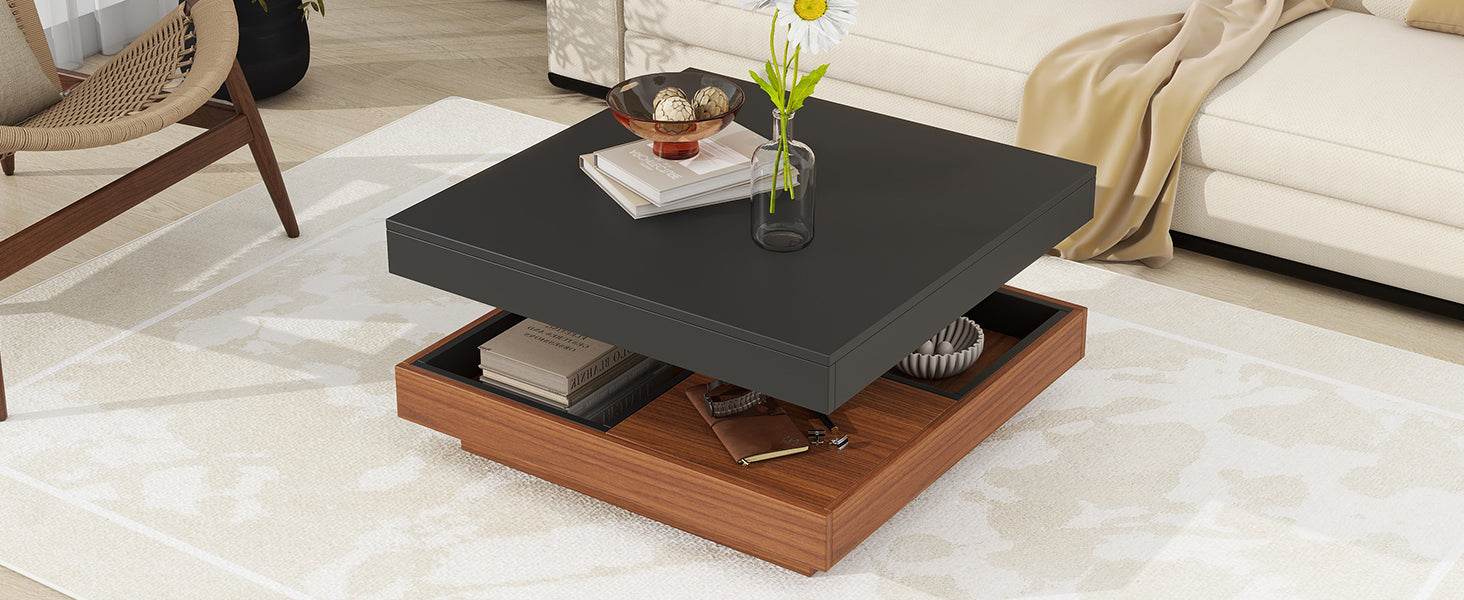 Modern square coffee table features a 360° rotating MDF top with three removable, reversible trays for versatile storage and display. Finished in black and dark walnut veneer, its sturdy design fits primary living spaces with easy maintenance and stylish farmhouse appeal.