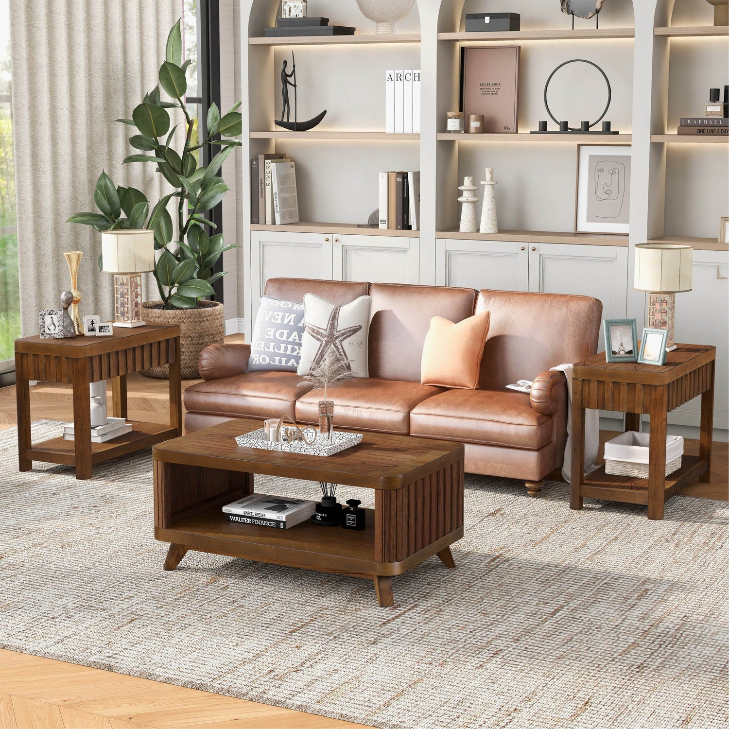 Bring warmth and functionality to your living space with this beautifully crafted wood coffee table. Featuring a 41.5-inch length and rich walnut finish, it blends classic design with modern practicality. The table top and lower shelf are made from MDF with a durable, waterproof solid wood veneer, ensuring long-lasting surface protection. Four solid pine wood legs provide exceptional stability, supporting up to 176 pounds on the tabletop. Its open storage shelf offers generous space to neatly organize books, snacks, or remotes, keeping your living room tidy and inviting. Designed with smooth curved edges, this coffee table is safe for homes with children and adds an elegant touch to any decor. Assembly is quick and straightforward, with all tools included for convenience. Upgrade your centerpiece with this versatile and sturdy coffee table today.