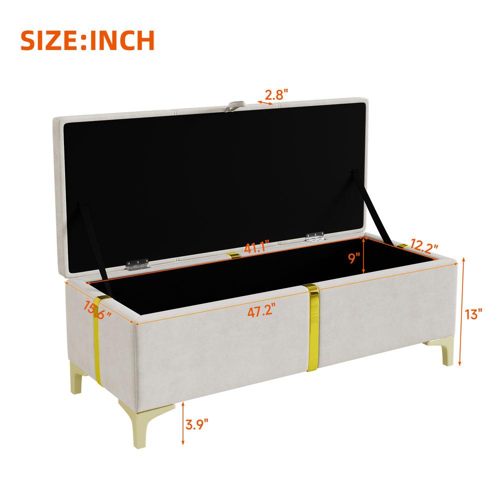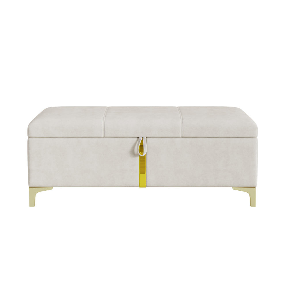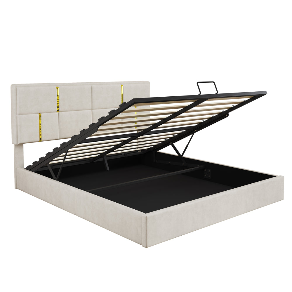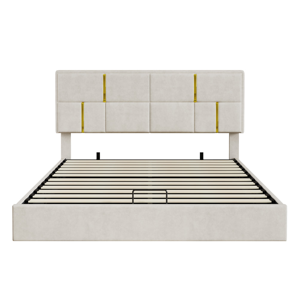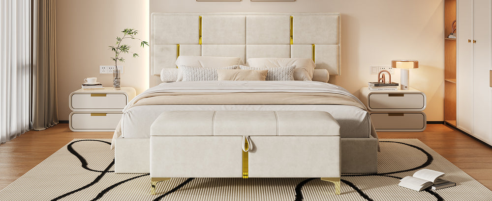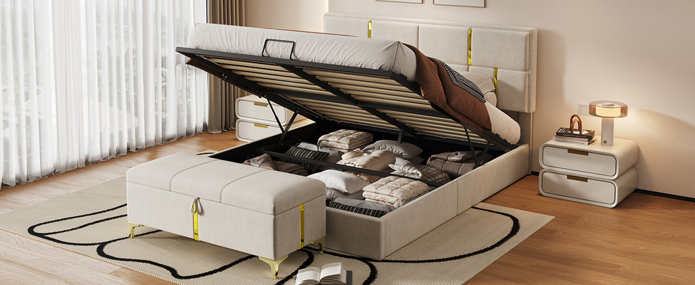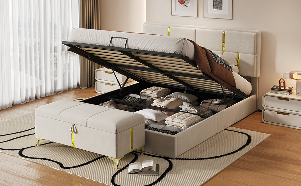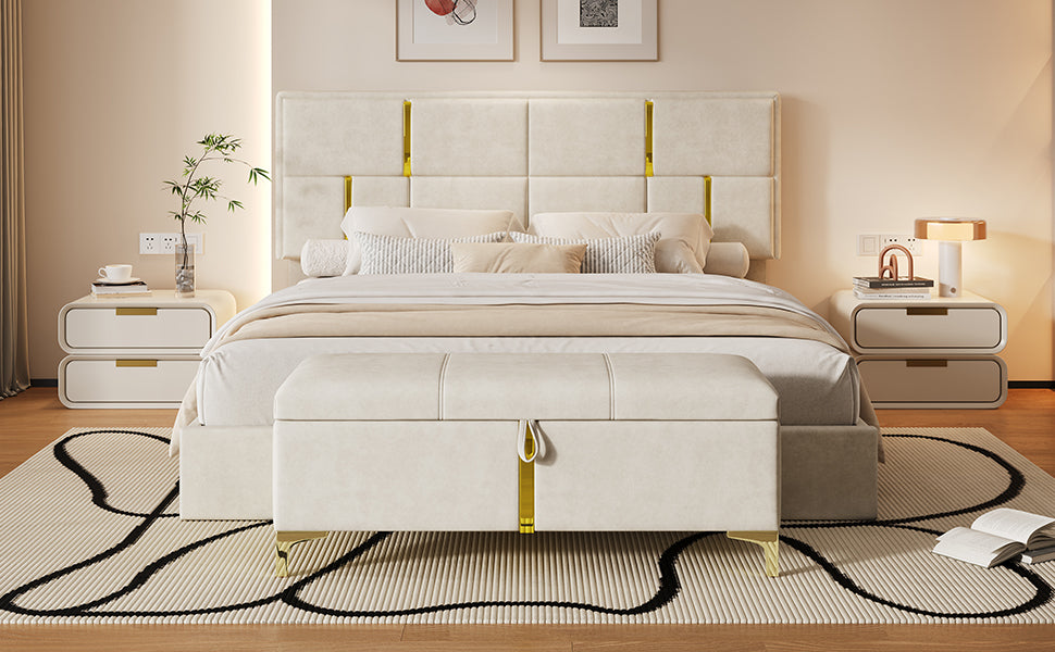 Experience timeless elegance and smart functionality with this 2-piece bedroom set featuring a queen size upholstered platform bed and a matching storage ottoman. The soft beige velvet upholstery and subtle gold accents on the headboard bring a sophisticated touch that complements any bedroom decor. Designed for comfort and convenience, the bed includes a hydraulic storage system beneath the mattress, ideal for stashing quilts, linens, and essentials. The storage ottoman with sturdy metal legs offers additional space for blankets, pillows, or magazines while doubling as a comfy seating option. Crafted from durable MDF, plywood, metal, and breathable velvet, this set supports up to 500 pounds on the bed and 250 pounds on the ottoman. Easy to assemble and built to last, this bedroom set combines style, sturdiness, and smart storage. Upgrade your space and simplify your organization—elevate your relaxation today.