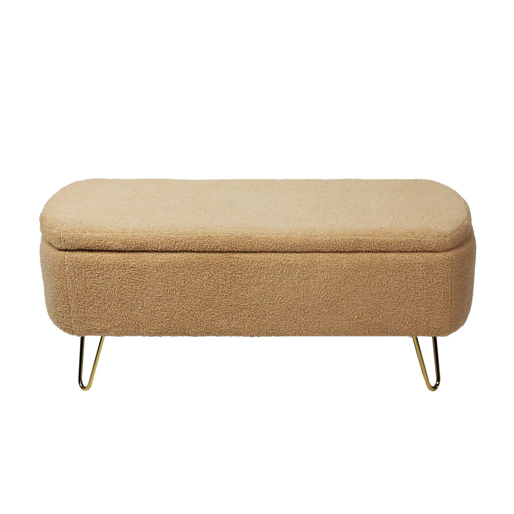 Camel storage bench features soft faux fur upholstery with padded seating and hidden storage, ideal for end-of-bed or entryway use. Its compact design enhances comfort and tidiness in living rooms or bedrooms while adding modern style with gold legs.