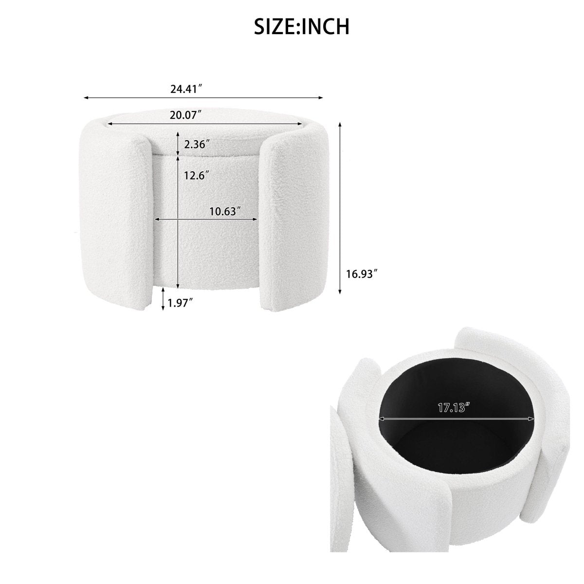 • Round storage ottoman offers 24.41 by 20.07 inches surface area