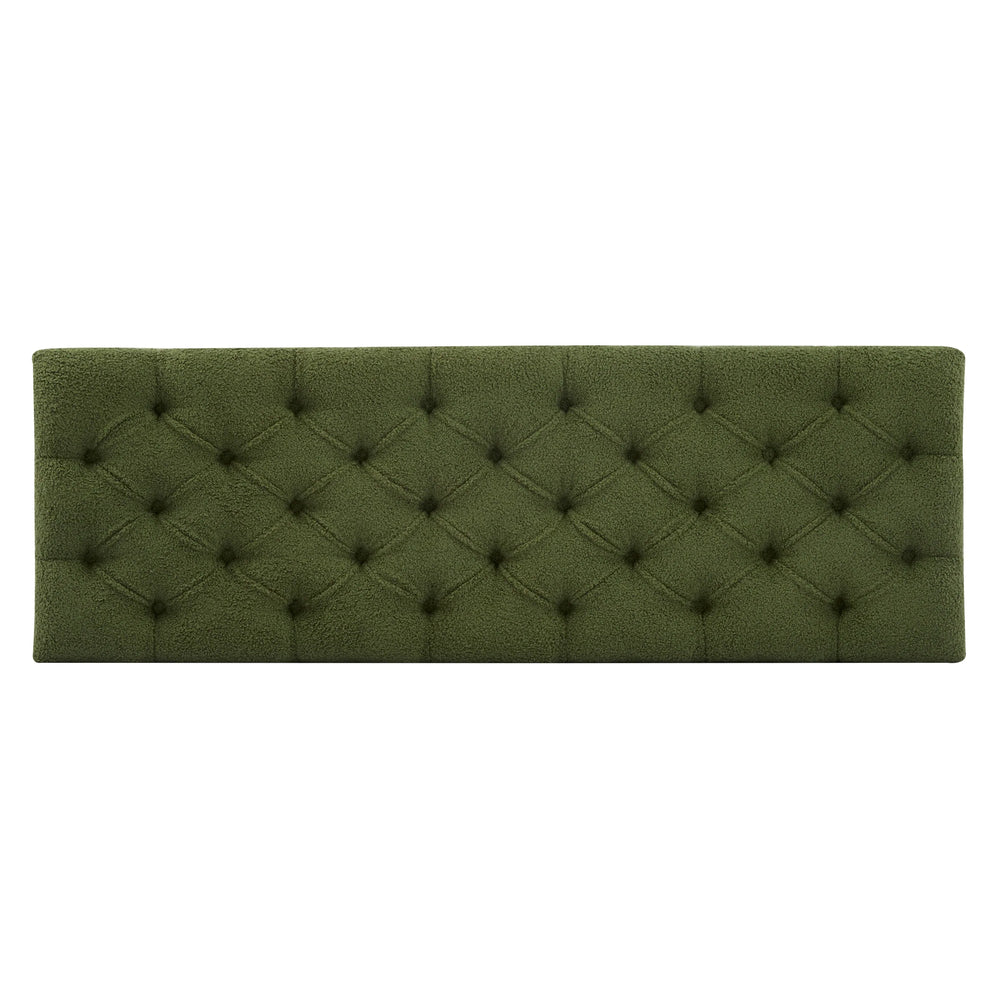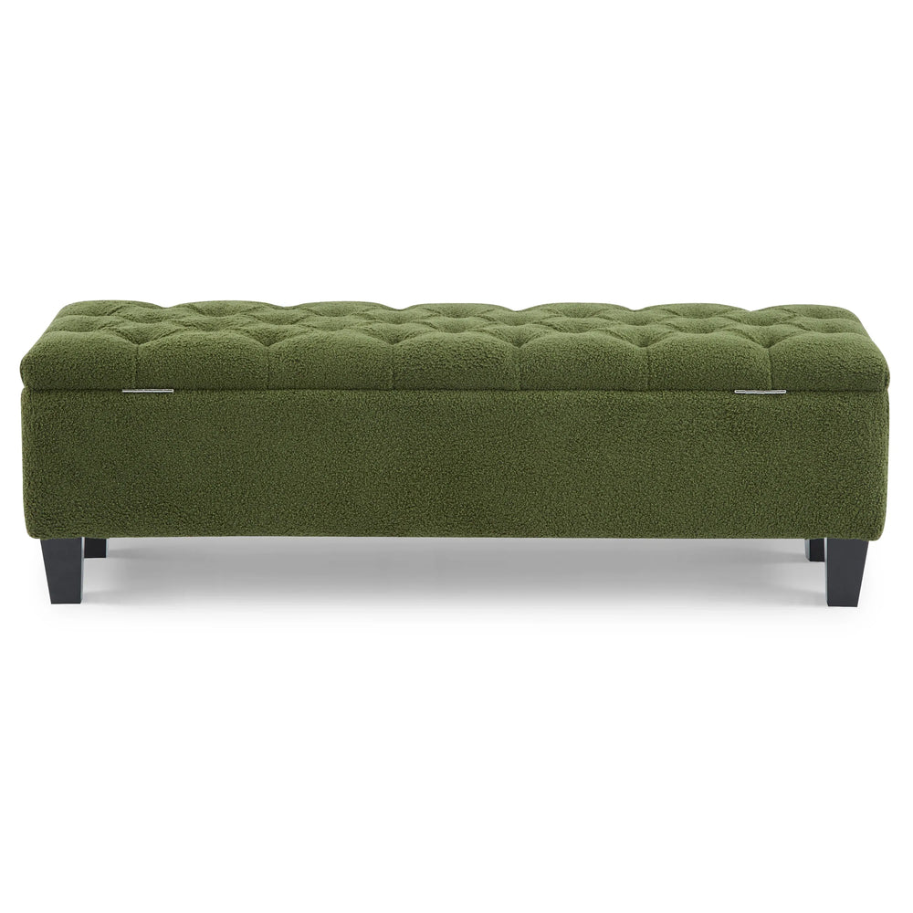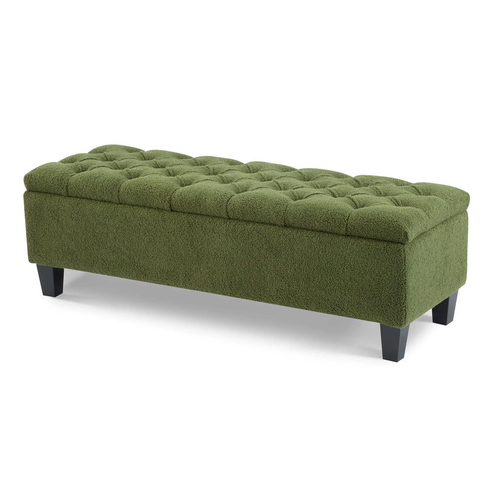 Combine practicality and elegance with this green boucle ottoman bench, designed to add both extra seating and smart storage to any room. Featuring a lush boucle-covered foam cushion atop sturdy rubber wood legs, it supports up to 300 lbs, assuring comfort and durability. The spacious interior neatly stores pillows, blankets, or everyday essentials, helping keep your space organized and clutter-free. Soft pressure hinges allow the lid to open gently and stay open for easy access, while the chic button-tufted diamond stitching adds a refined touch to your living room, bedroom, or foyer. Measuring 50.75 inches long, 17.5 inches deep, and 16.33 inches high, this ottoman fits seamlessly in various spaces without dominating the room. Elevate your home’s style and functionality today.