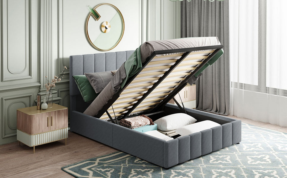 Full-size upholstered platform bed features a sturdy plywood frame with a linen fabric headboard for added comfort and style. The hydraulic storage system offers extra space for bedding essentials, and 12 reinforced slats provide strong mattress support without a box spring.