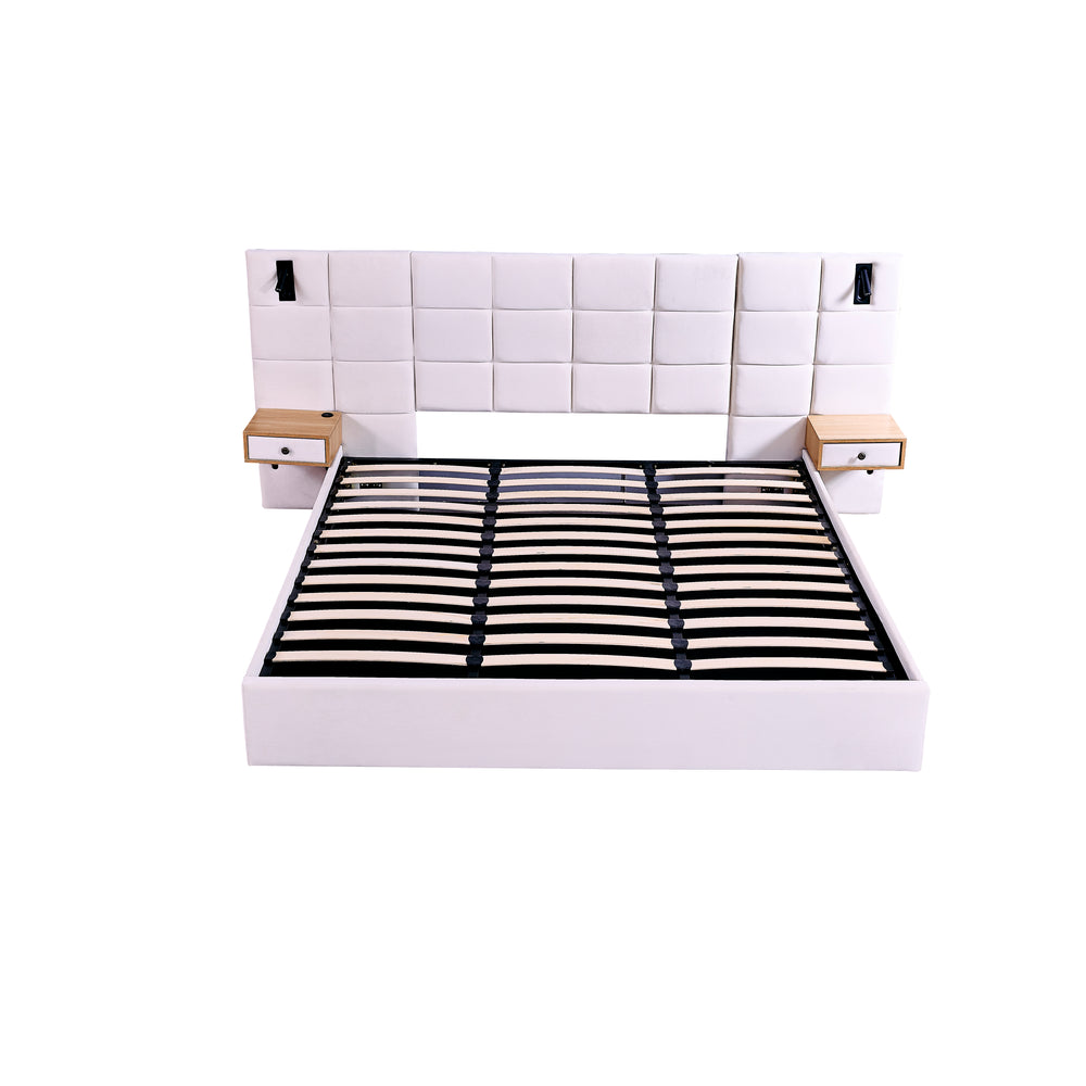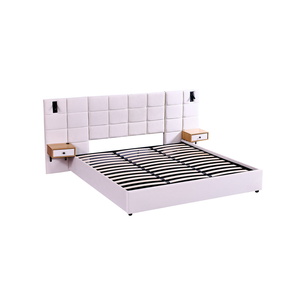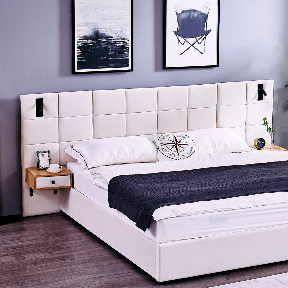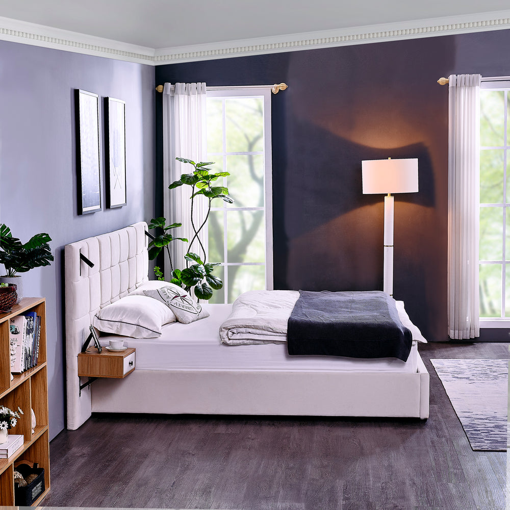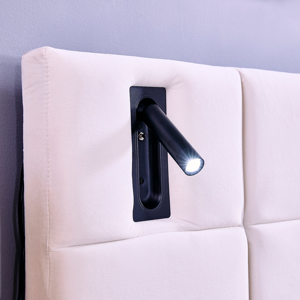 Elevate your bedroom with this luxurious king size platform bed, featuring soft beige velvet upholstery and foam-filled cushioning for a plush yet durable feel. Designed with convenience in mind, the hydraulic storage system offers ample space beneath the bed to neatly organize clothes, linens, and more, keeping your room clutter-free. Two built-in shelves replace the need for bedside tables, offering easy access to essentials. Enhanced with two adjustable reading lamps and an integrated USB charging port, this bed blends style with modern functionality. Crafted from solid wood, plywood, and metal, it supports up to 500 pounds with a sturdy and wobble-free frame. Measuring 105 inches in length, 87 inches in width, and 46 inches in height, this bed’s impressive dimensions create a commanding bedroom centerpiece. Assembly is simple, requiring no box spring. Upgrade your sleep space today and enjoy the perfect balance of comfort, storage, and sophisticated design.