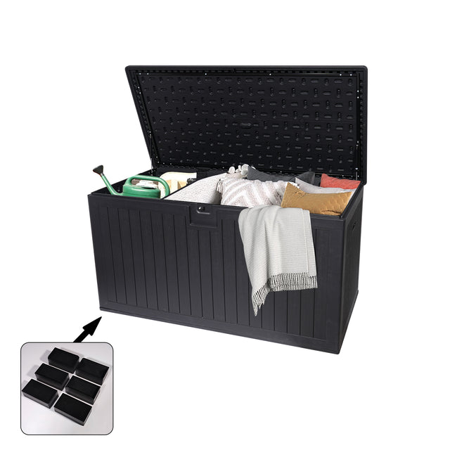 This weather-resistant black resin outdoor deck box offers 260-gallon waterproof storage for patio cushions, pool accessories, and garden tools. Featuring a lockable lid, hydraulic hinges, removable divider, and bonus feet to keep contents dry, it doubles as versatile patio seating or a table.
