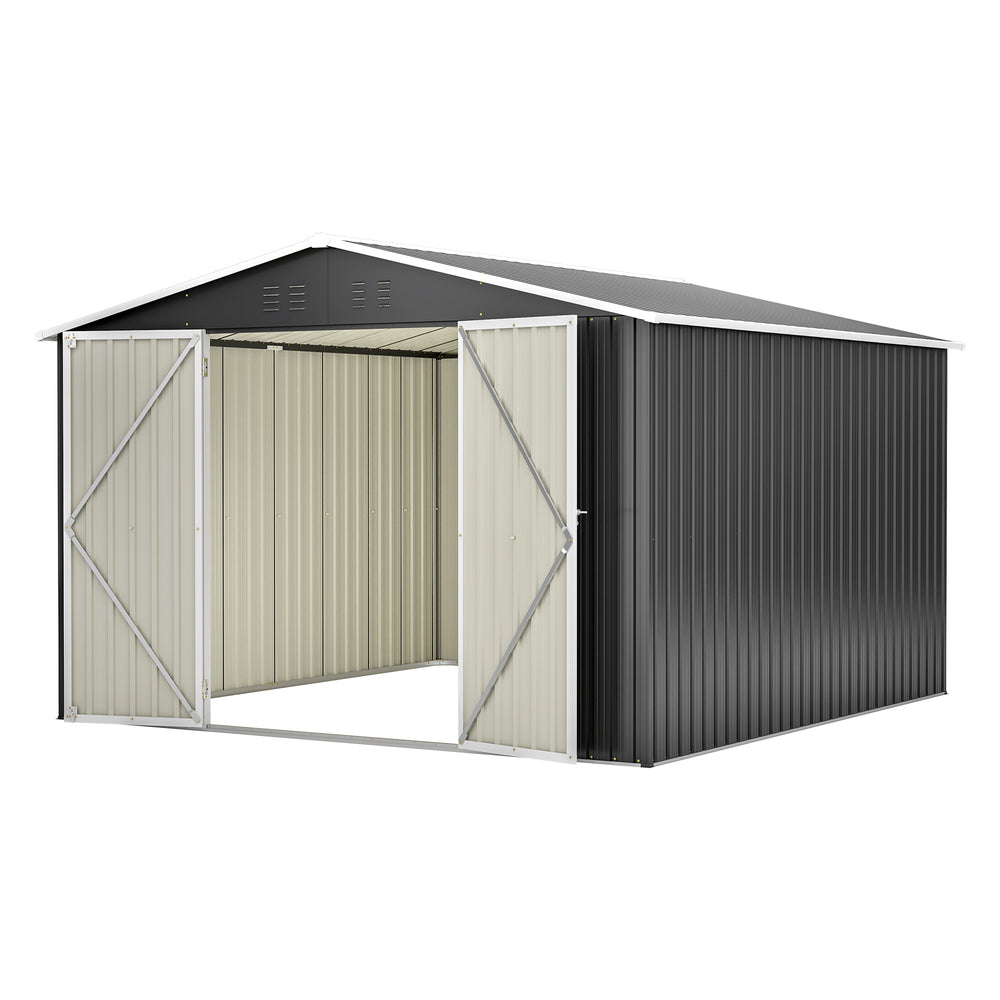Organize your backyard, patio, or lawn with this spacious outdoor storage shed designed to keep your tools and equipment safe and accessible. Crafted from sturdy galvanized metal and aluminum, it offers superior protection against weather with a sloped roof and UV-resistant black finish. The sizeable interior space measuring approximately 118 inches long by 123 inches wide and over 79 inches high provides ample room for garden tools, lawn mowers, and seasonal gear. Thoughtful ventilation design promotes airflow to reduce moisture buildup, while the sliding lockable doors ensure easy access and enhanced security for your belongings. Versatile and practical, this metal garden shed can also serve as a pet shelter or general storage solution. Simplify your outdoor organization and protect your valuables by adding this reliable storage shed to your home today.