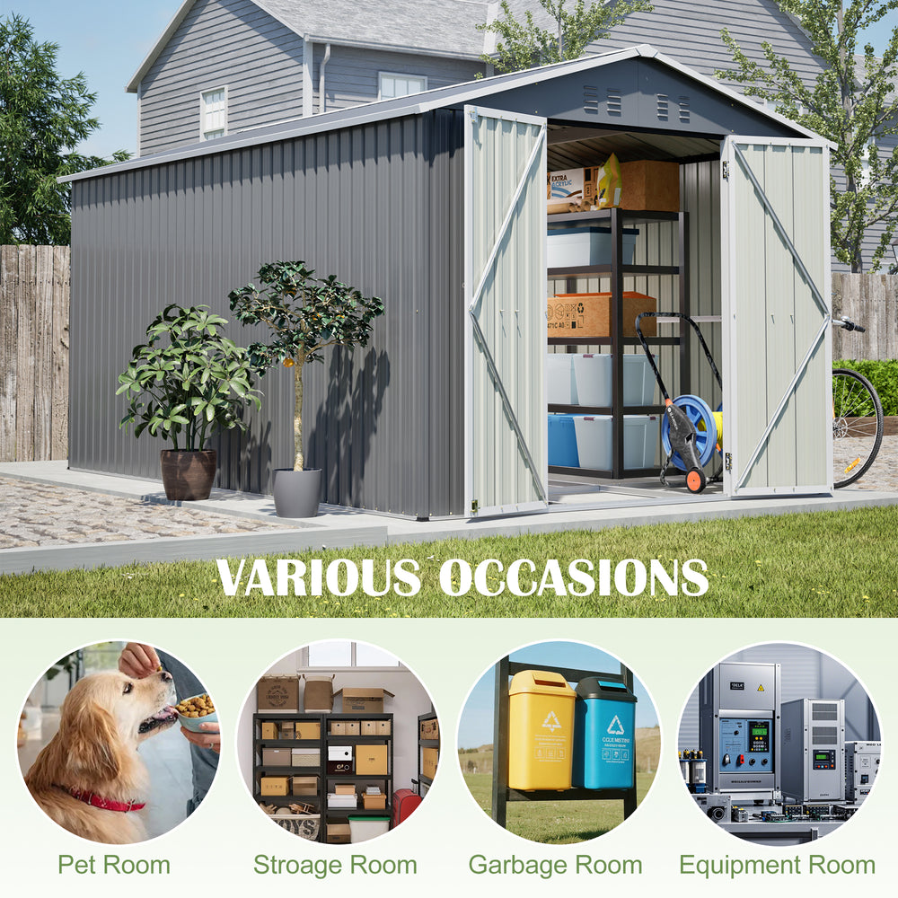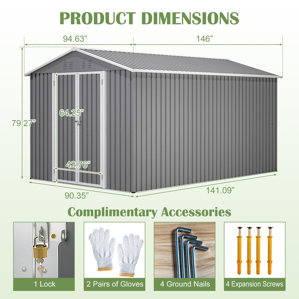 Keep your backyard, garden, or patio tidy with this spacious 8 x 12 foot outdoor storage shed. Crafted from durable galvanized steel with a sturdy aluminum frame, it offers secure, long-lasting protection for your lawn equipment, bicycles, tools, and more. The lockable double doors provide convenient, wide access for storing large items hassle-free. Designed with a sloped, water-shedding roof and ventilation vents, this storage shed helps prevent moisture buildup and heat accumulation, preserving your belongings all year round. Its versatile design also functions as a pet house or garden workshop, making it a practical addition to your outdoor space. Easy-to-follow assembly instructions ensure you’ll have it ready in no time. Elevate your backyard storage solution today.