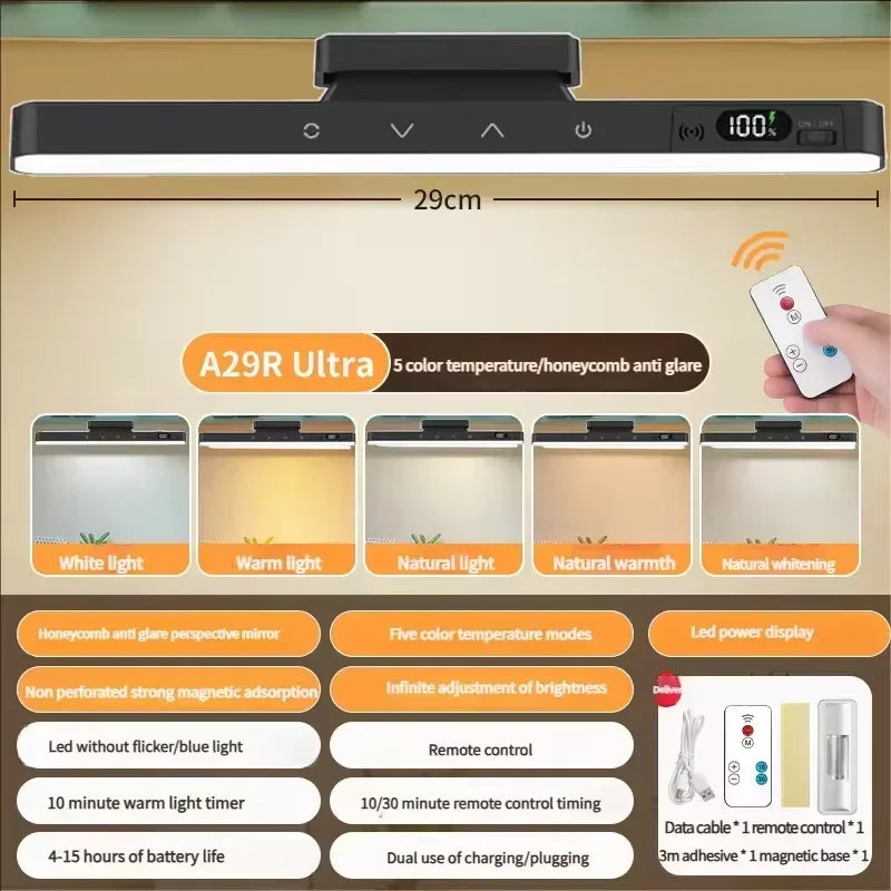 Elevate your workspace or bedside with this innovative touch table lamp featuring a powerful 1200mAh rechargeable battery. Designed with a magnetic 360° rotation base, it effortlessly attaches to metal surfaces like desks, lockers, or bed frames for hands-free convenience. The stepless dimming function lets you customize brightness from 10% to 100%, while five color temperature options—from warm 3000K to cool 6000K—comfortably adapt to reading, relaxing, or working. Its honeycomb anti-glare LED technology protects your eyes during late-night tasks, reducing strain and fatigue. Compact and lightweight at 11.8 inches (30 cm) long, this lamp is perfect for dorms, apartments, and outdoor use. Dual power options include built-in battery operation with up to 6 hours runtime or continuous USB plug-in to suit your lifestyle. With its remote control and timer shutoff, you can easily tailor lighting to your needs. Brighten any space with glare-free, portable illumination—elevate your lighting experience today.