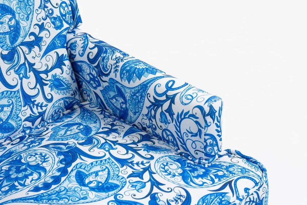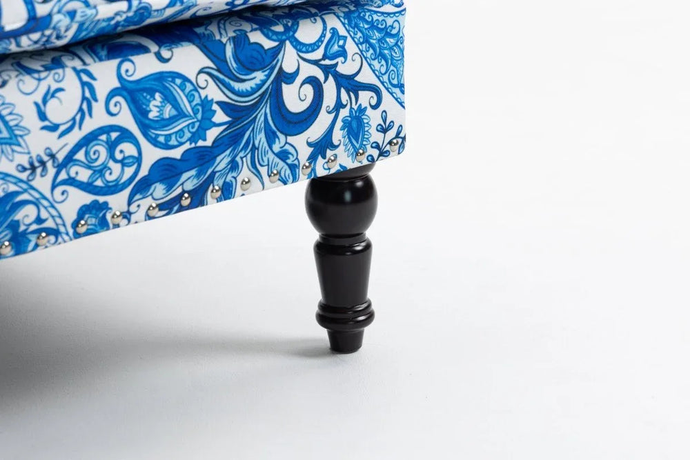 Elevate Your Living Room with Our Vintage Blue and White Upholstered Accent Chair