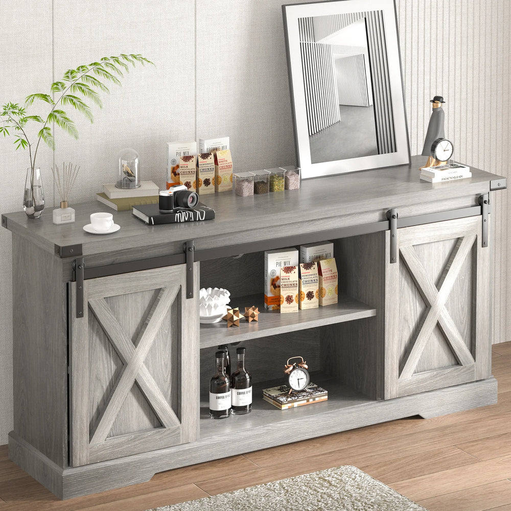 Bring rustic charm and practical storage to your home entertainment setup with this farmhouse TV stand. Crafted from high-quality wood with a natural wood grain finish, it features sliding barn doors on sturdy black iron tracks for smooth and quiet operation. This versatile media console accommodates TVs up to 65 inches while offering ample storage space to keep your media devices, gaming consoles, and accessories organized. Adjustable shelves provide flexible storage options for items of varying heights, and the reinforced tabletop supports up to 300 pounds for your heaviest electronics. Its timeless farmhouse design blends vintage style with modern functionality, making it a perfect centerpiece for your living room. Easy to assemble and maintain, this TV stand elevates both the look and function of your space. Upgrade your home entertainment today.