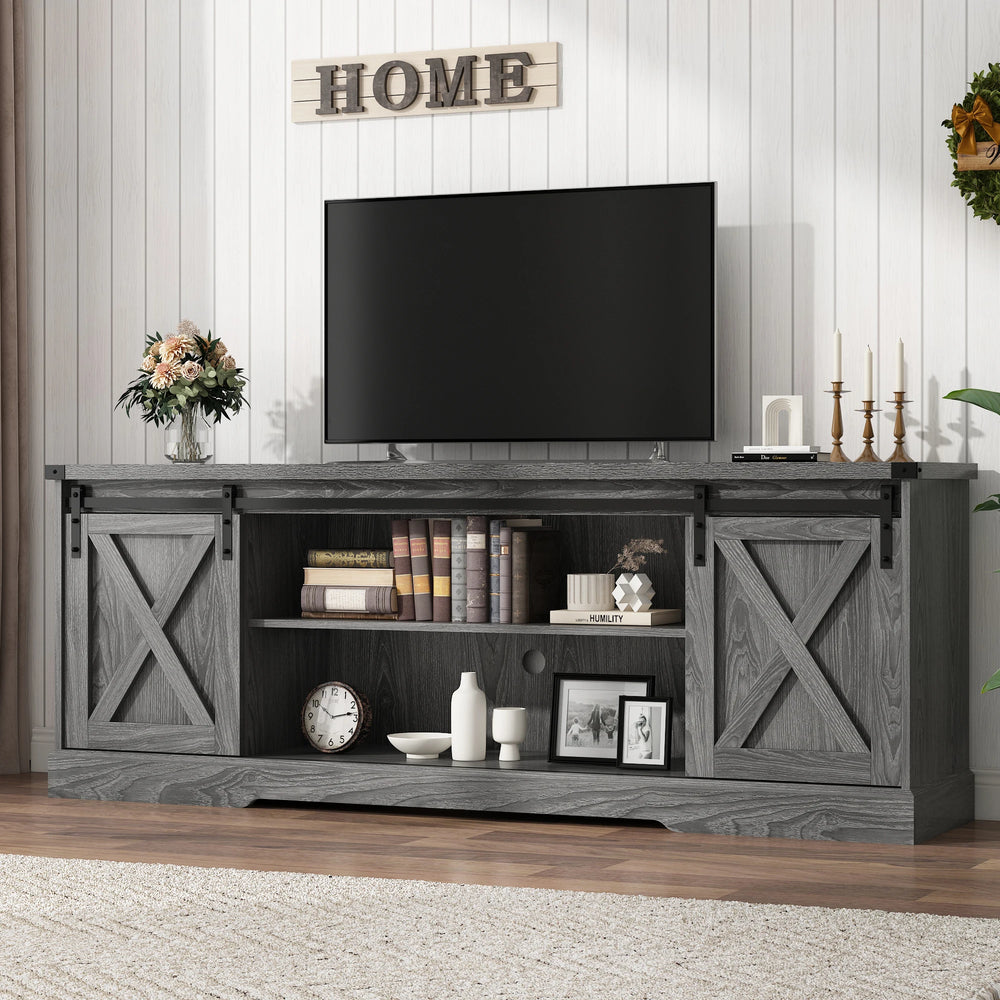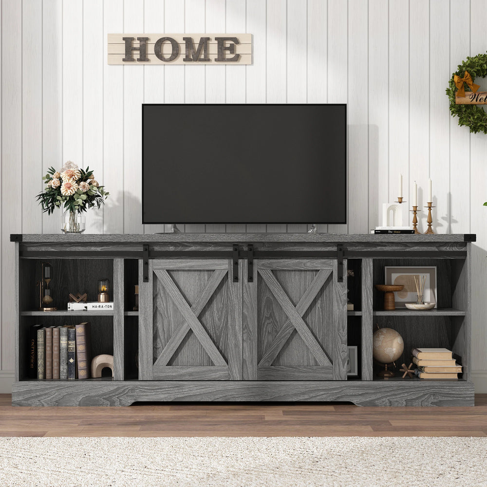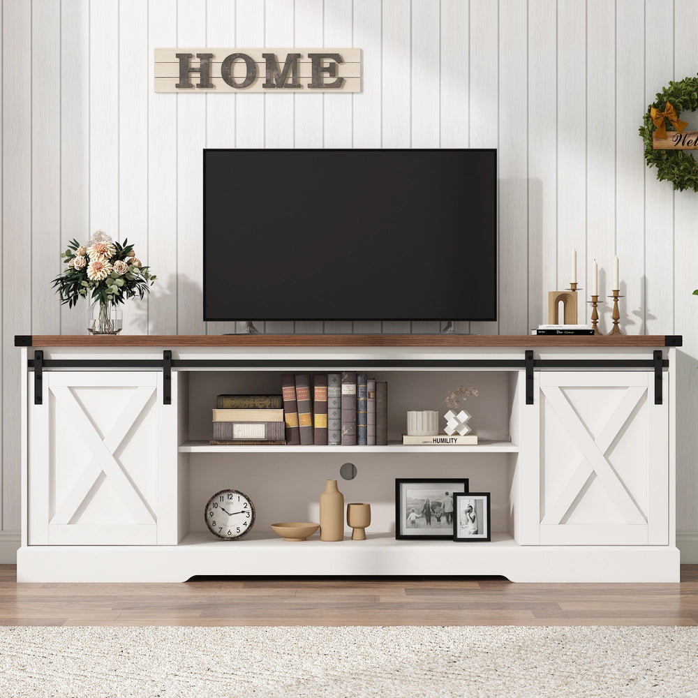 Farmhouse-style living room furniture featuring a spacious wooden TV stand with smooth sliding barn doors and adjustable shelves for flexible storage. Supports up to 300 lb top load, ideal for media consoles and home entertainment organization.