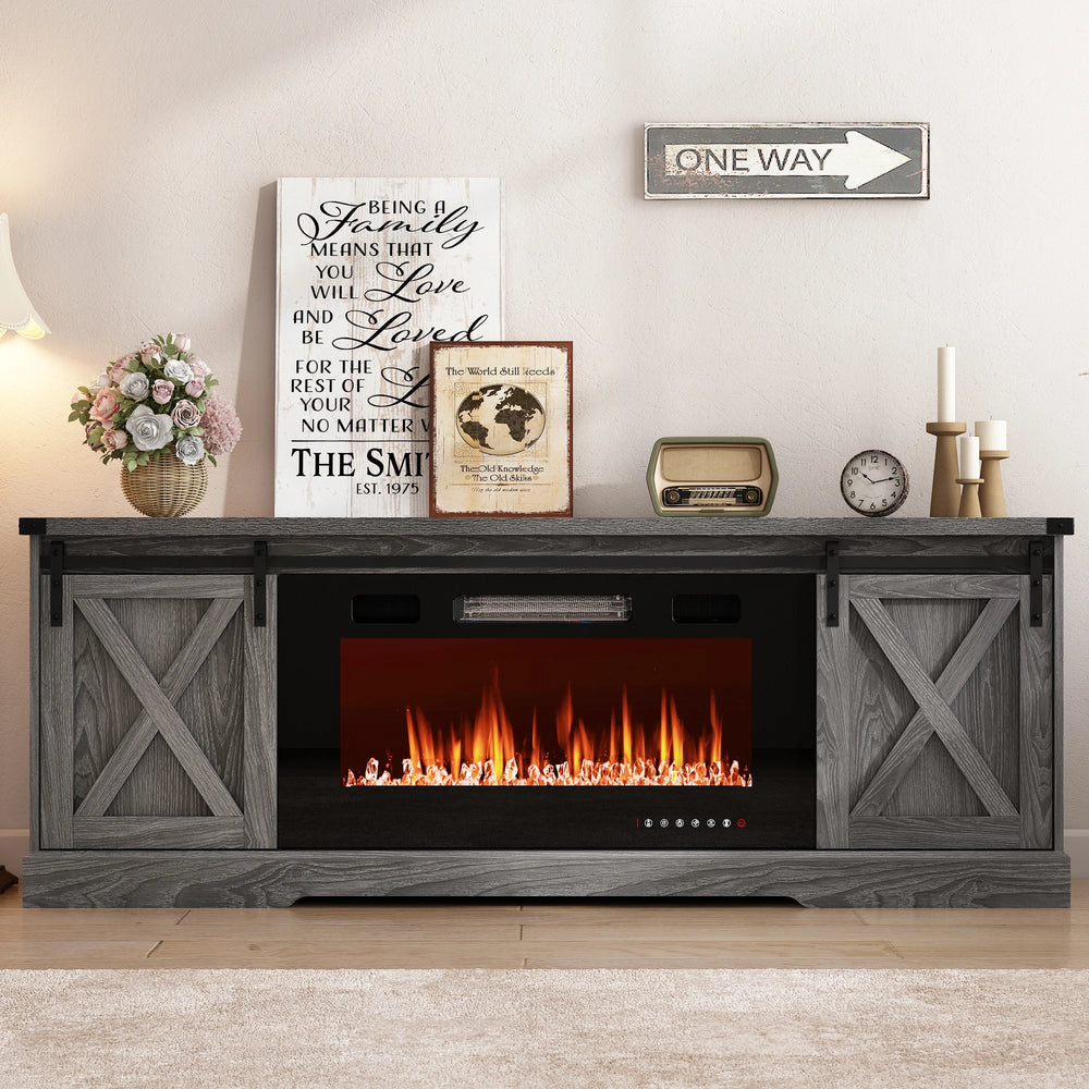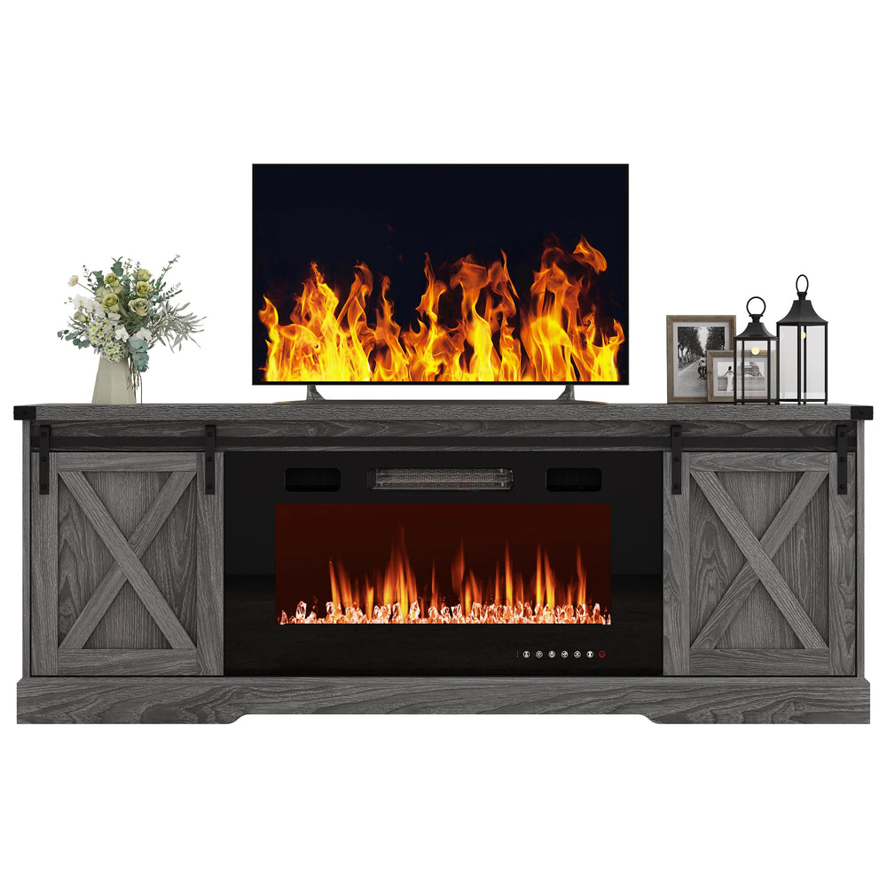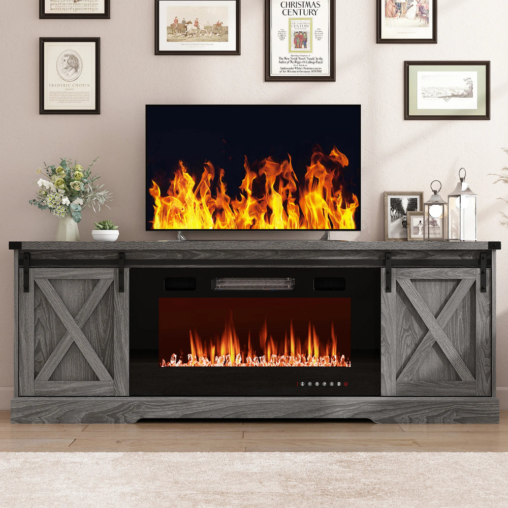 Bring rustic charm and practical functionality to your living space with this farmhouse-style Fireplace TV Stand, designed to accommodate TVs up to 75 inches. Crafted from high-quality wood with a natural grain surface, it blends traditional aesthetics with modern convenience. The smooth-sliding barn doors, supported by durable black iron rails, offer easy access while adding vintage flair. Ample storage includes six cubbies and adjustable shelves, perfect for organizing media devices, decor, or even a 36-inch fireplace insert. With a generous top panel supporting up to 300 pounds, you can safely place your TV, coffee maker, or cherished collectibles. Its sturdy construction and versatile design make it ideal as a media console, storage cabinet, or buffet sideboard. Easy assembly and low-maintenance materials ensure this piece will enhance your living room for years to come. Elevate your home entertainment experience today.