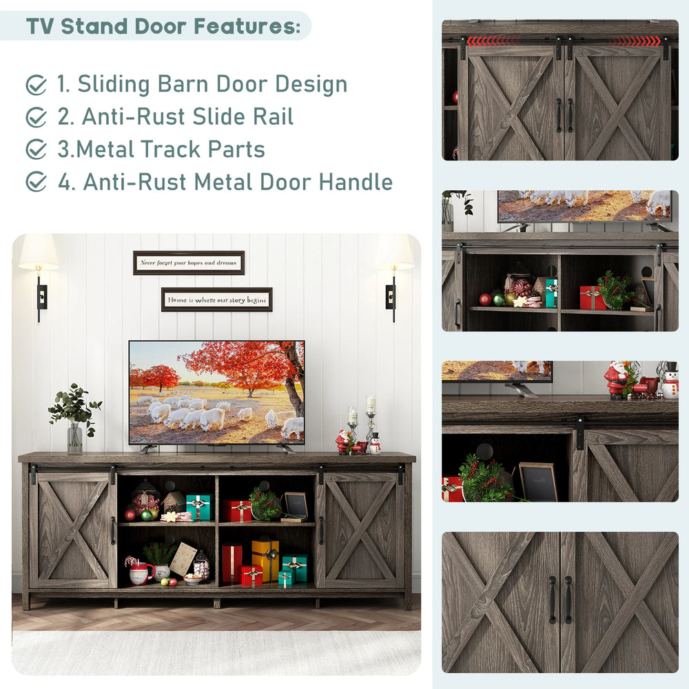 QiaoShiRen rustic farmhouse TV stand features sliding barn doors and adjustable shelves for versatile storage, supporting 60-75 inch TVs. Made of durable engineered wood with metal slides, it blends traditional style with functional concealed and open storage for living rooms.