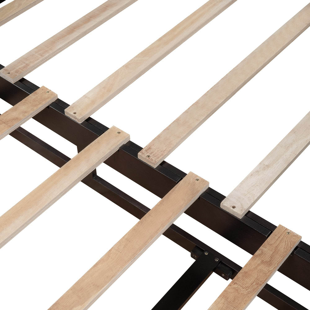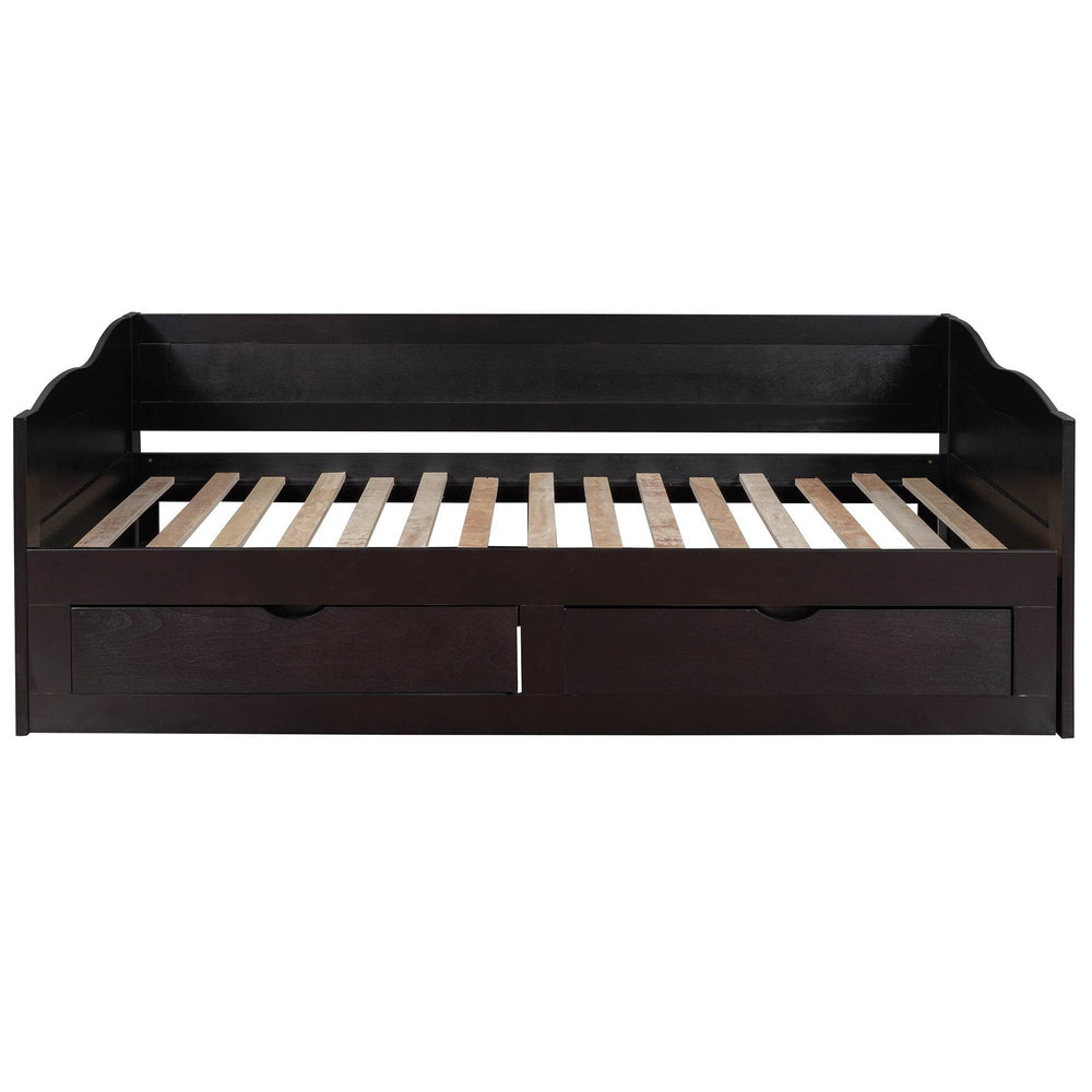 Discover the perfect solution for versatile living spaces with this solid wood daybed in a rich espresso finish. Crafted with durable plywood, MDF, and pinewood, it offers lasting strength and stability without the need for a box spring. The innovative extendable trundle design easily expands from a twin size bed to an irregular king size, ideal for accommodating guests or growing families. Dual spacious storage drawers keep blankets, pillows, and linens neatly organized, making it an excellent choice for guest rooms, kids’ rooms, or living areas. With dimensions of 77.2 inches long, 76.4 inches wide, and 29 inches high, this stylish sofa bed fits seamlessly into any home décor. Easy assembly and a reliable slat system provide solid support and comfort. Elevate your space with functional elegance today.
