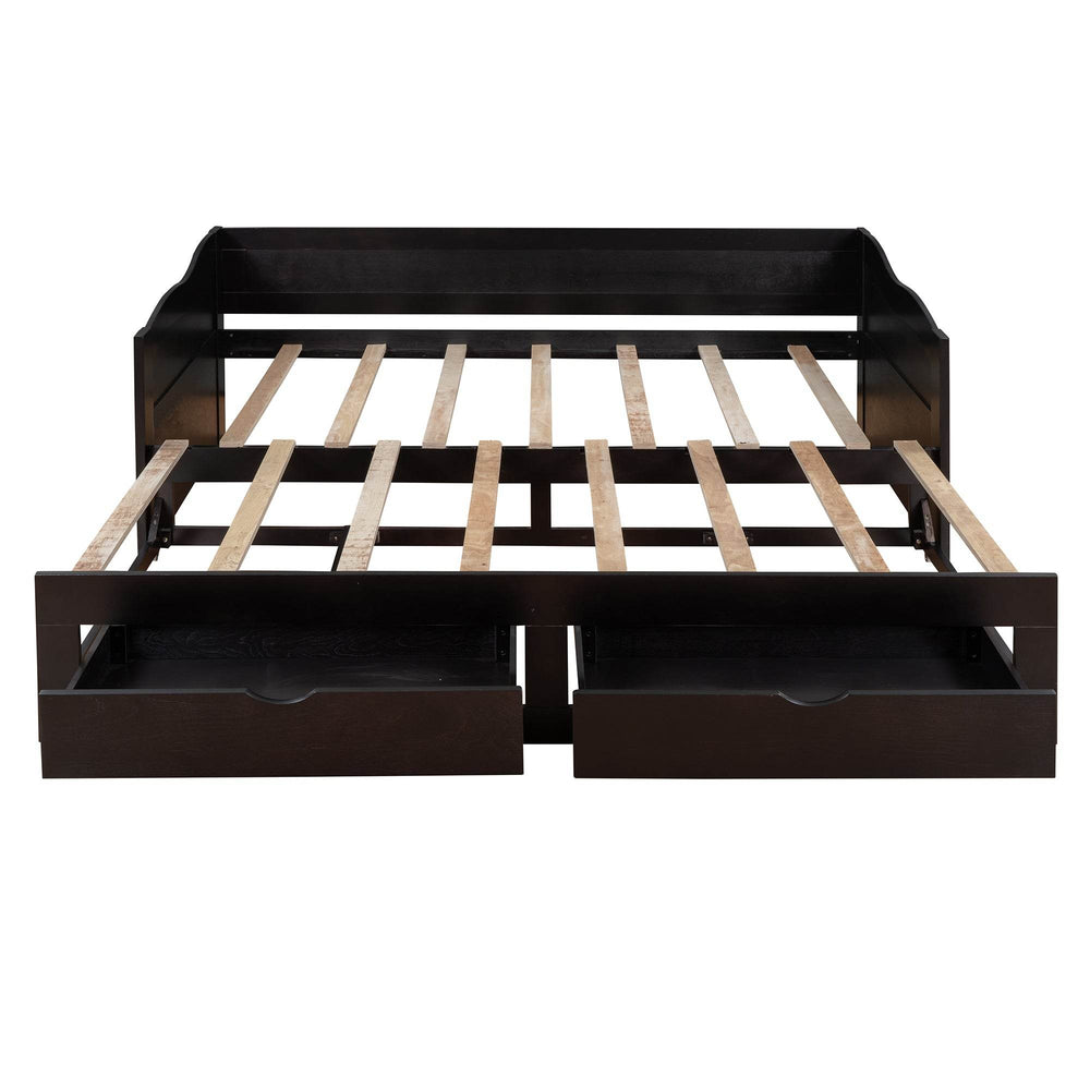 Extendable wooden daybed with sturdy solid wood frame and two storage drawers offers versatile comfort for kids or guest rooms. Expands from twin to irregular king size without box spring, ideal for multi-functional spaces and easy mattress placement.