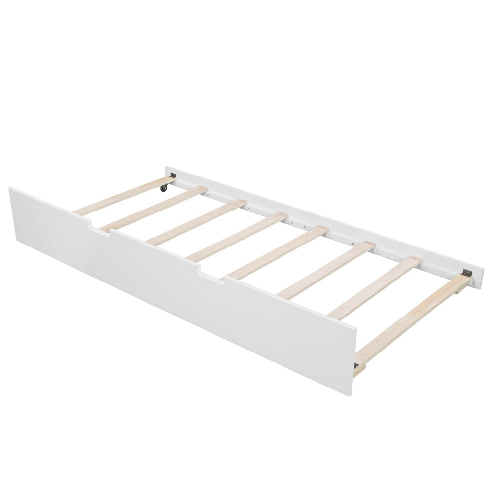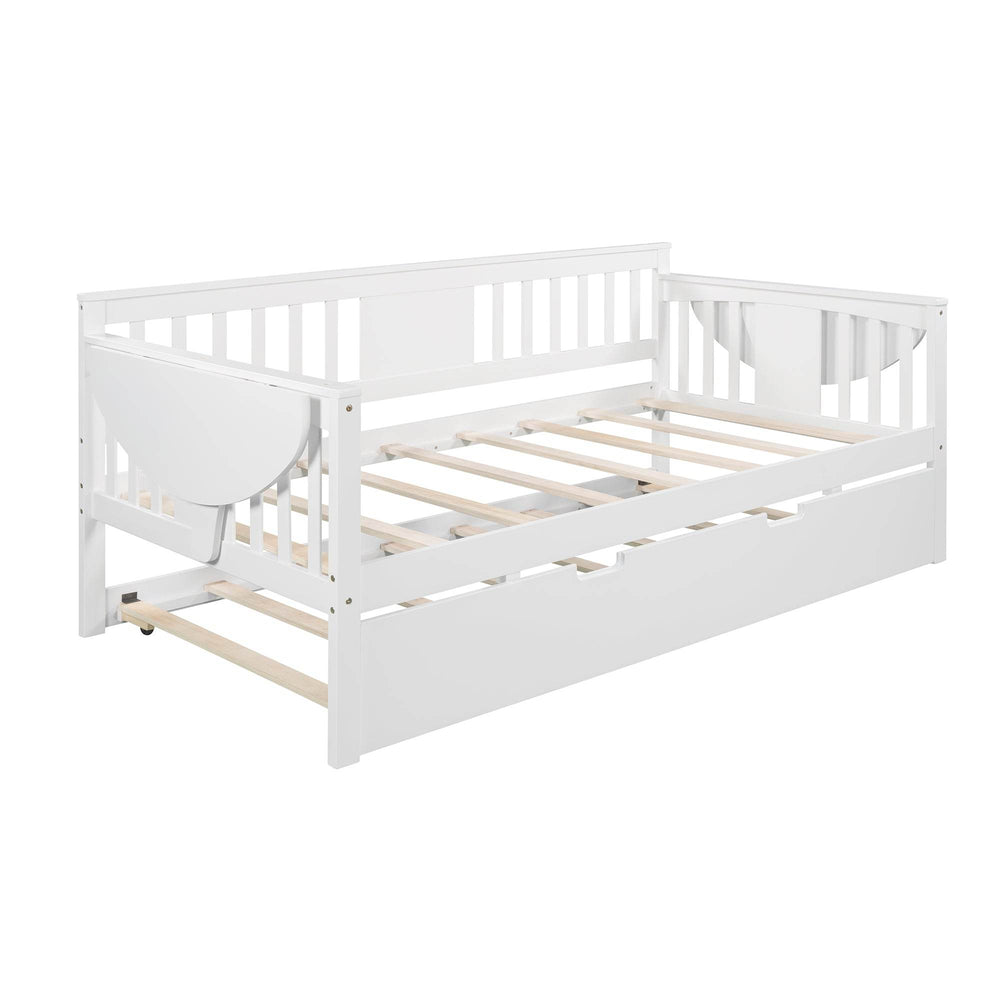 Discover the perfect blend of functionality and elegance with this solid wood twin daybed featuring a convenient trundle bed. Crafted from high-quality pinewood and plywood, the sturdy frame resists humidity changes to prevent cracks, ensuring long-lasting durability. Its clean white finish complements any bedroom or living room décor, creating a versatile space that transforms from a cozy sofa to a comfortable sleeping area in seconds. The trundle easily slides out to provide a second twin-size bed, ideal for guests or small spaces. Practical side tables on each end offer convenient spots for your coffee, books, or decorative accents. This daybed’s compact footprint (79.5”L x 41”W x 34.1”H) and smart design make it a space-saving essential for homes that value style and function. Easy to assemble and no box springs needed, elevate your room organization and comfort today.