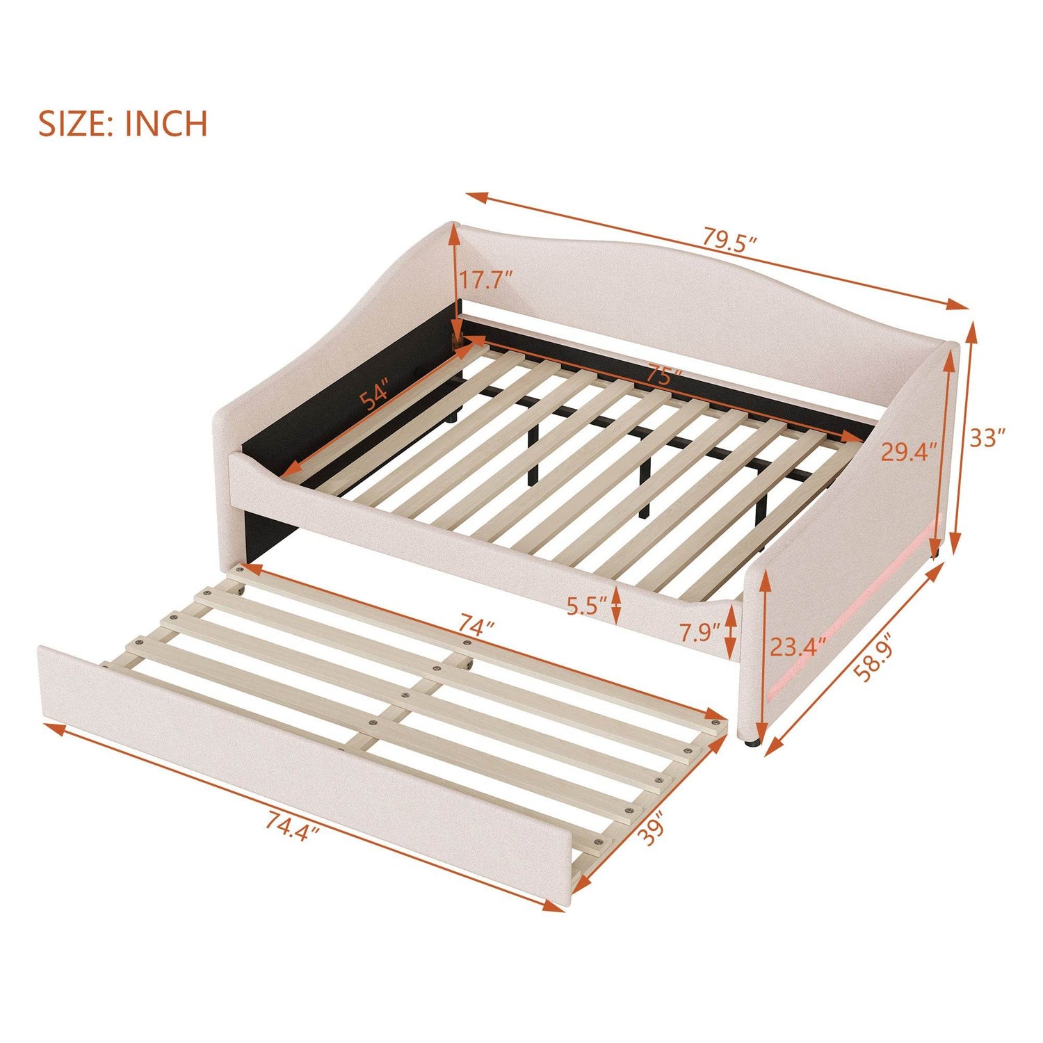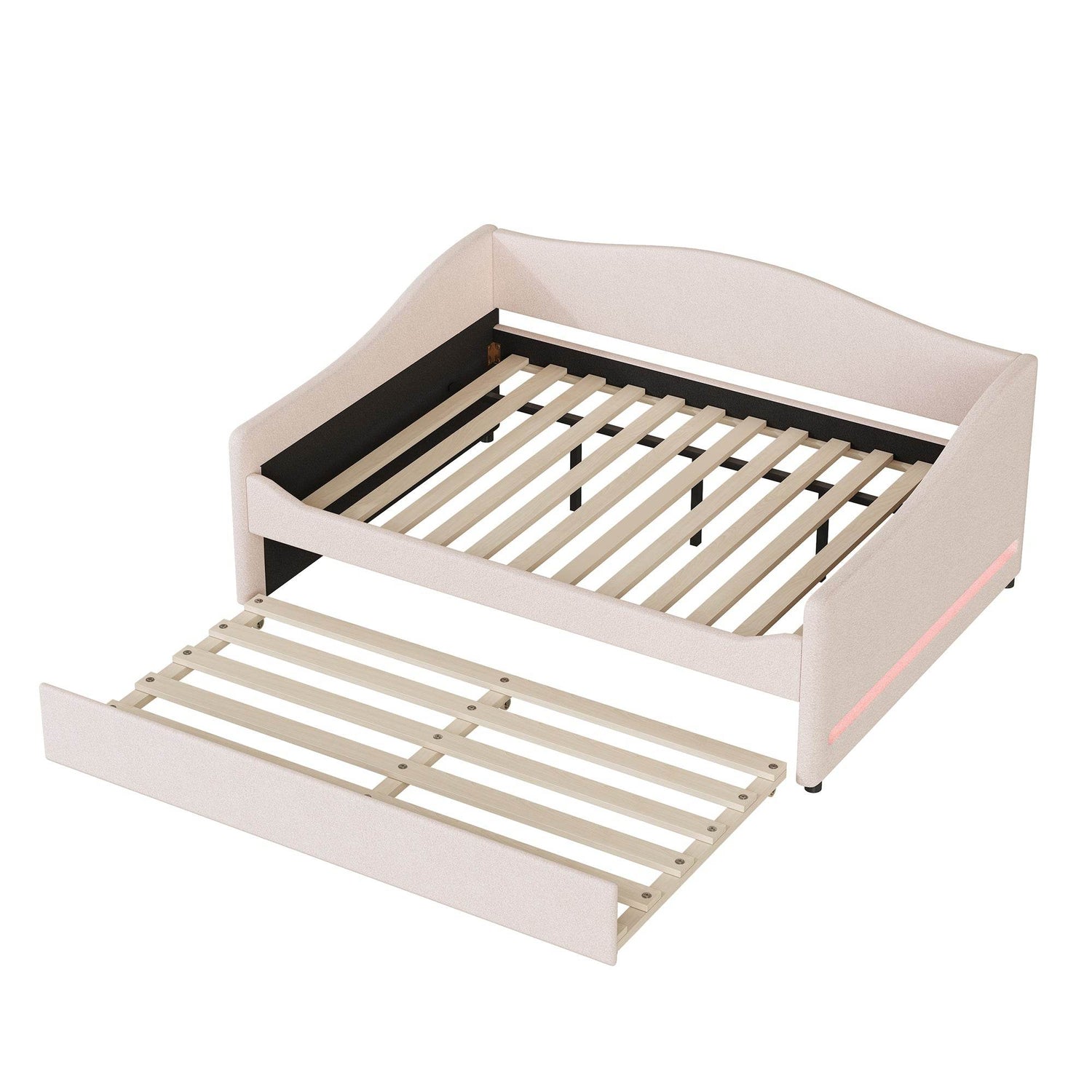 Upgrade your living space with this cozy and versatile full-size upholstered daybed, wrapped in soft teddy fleece in a warm beige tone. Its eye-catching embossed light stripe accents add a modern artistic touch, making it a charming focal point in any room. Perfectly designed for small spaces, it features a convenient twin-size trundle that smoothly rolls out to provide an extra sleeping area for guests or sleepovers. The integrated smart LED lighting, controllable via a mobile app, creates customizable moods — from romantic to functional nightlight settings. Constructed with sturdy plywood and supported by multiple slats, this daybed supports up to 500 lbs on both the main bed and trundle, ensuring durability and comfort. Assembly is straightforward with included hardware and instructions. Elevate your home’s style and functionality today with this plush, multi-purpose upholstered daybed.
