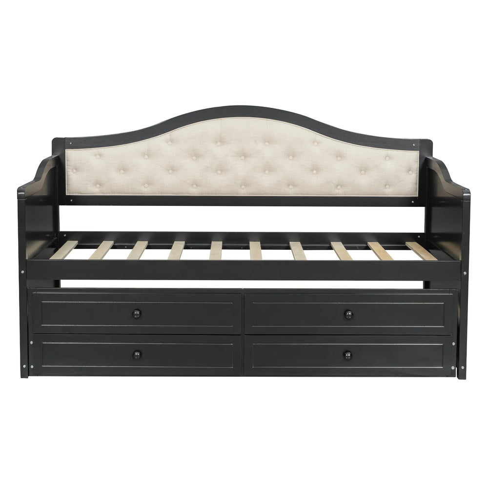 This black wooden twin daybed features a pull-out trundle expanding to two twin beds, two spacious storage drawers, and an upholstered button-tufted backrest for added comfort and style. Ideal for guest rooms or space-saving seating and sleeping solutions.