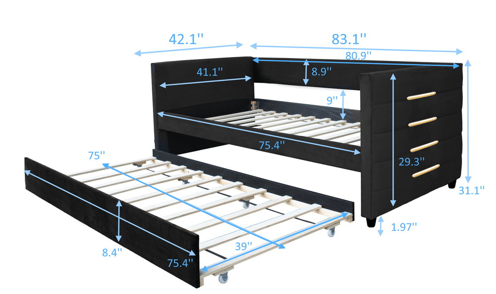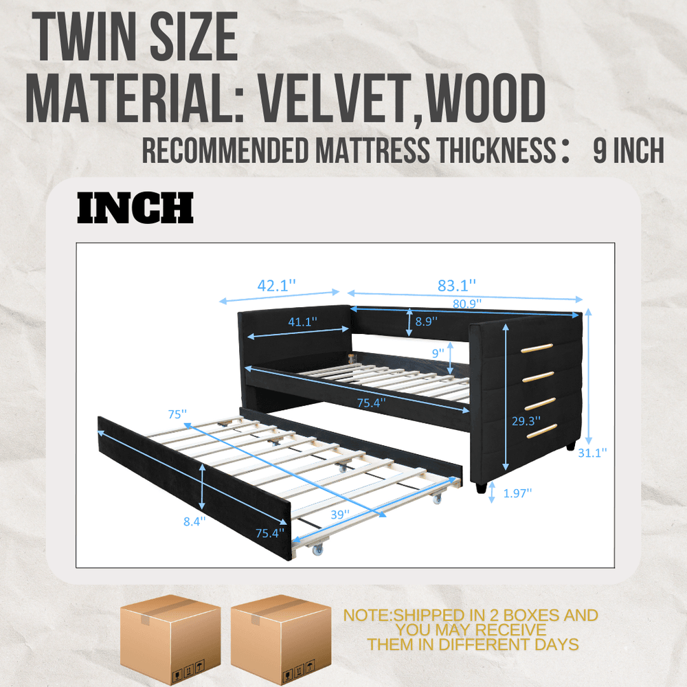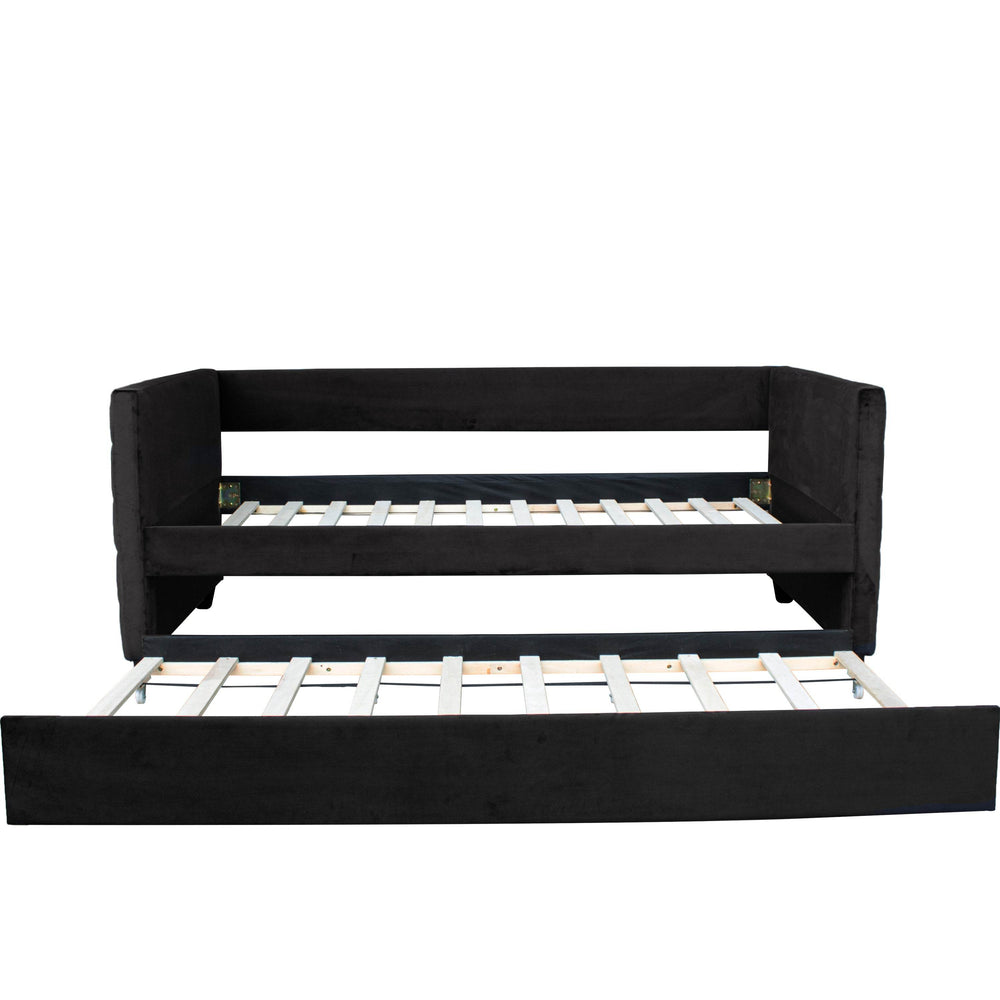 Bring a perfect blend of style and functionality to your bedroom or living room with this modern twin size daybed. Upholstered in plush black velvet and accented with elegant gold-tone strips, it offers a sophisticated minimalist design that complements contemporary interiors. By day, enjoy comfortable seating with fiber foam cushioning, and by night, easily transform it into a restful twin-size bed. The included pull-out trundle bed adds versatile sleeping space for guests without sacrificing room size. Crafted from durable espresso-toned rubberwood with sturdy metal supports, this daybed provides stable, long-lasting comfort without the need for a box spring. Its removable trundle on wheels allows effortless use and customization. Ideal for small spaces, guest rooms, or home offices, this multi-functional sofa bed elevates your home’s style and practicality. Assembly is simple and quick with the provided tools and instructions. Upgrade your space with this chic and convenient daybed—make room for relaxation today.